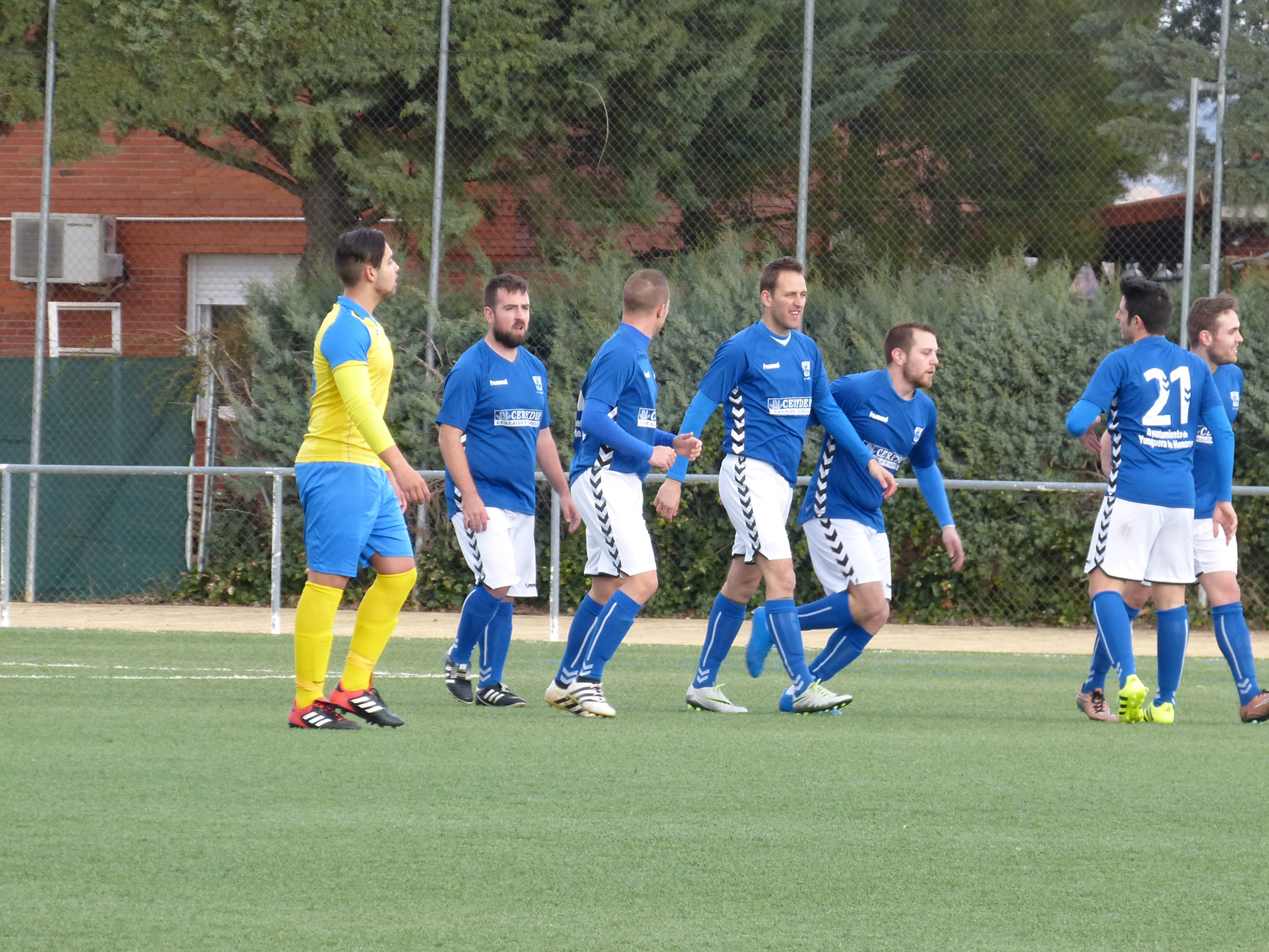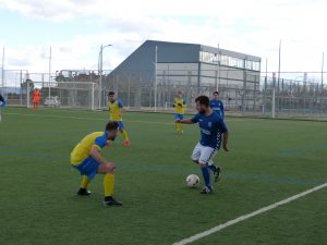 Desde el primer minuto los azulones tuvieron mejor disposición táctica que su rival en el terreno de juego desplazando el balón al primer toque y con continuos desmarques de ruptura que les permitía salir de la presión que el conjunto yunclereño ejercía en todo momento. Fruto de ese fulgurante comienzo llegaba el primer gol para los locales cuando Javier Robledo aprovechaba un buen centro desde la izquierda de Mario de Pedro para bajar el balón y marcar. Corría el minuto tres cuando el primer tanto subía al marcador para los azulones y eso no les supuso bajar el ritmo a los de casa intentando dejar encarrilado el encuentro cuanto antes. Y así fue, porque apenas siete minutos después del primer tanto yunquerano llegaba el segundo obra de nuevo de Javi Robledo que sacando provecho de una buena presión robaba la cartera al guardameta visitante para después de regatearle lanzar una perfecta vaselina y marcar.
