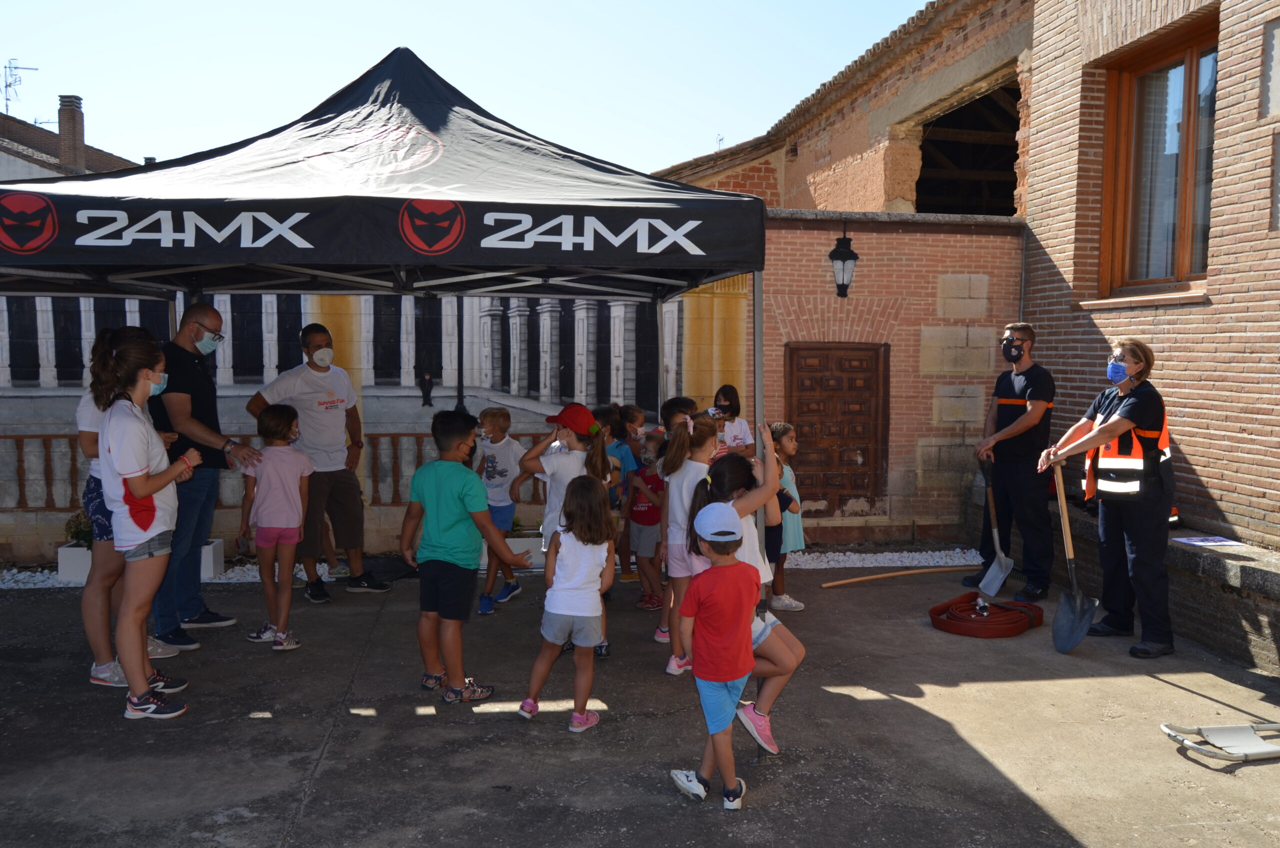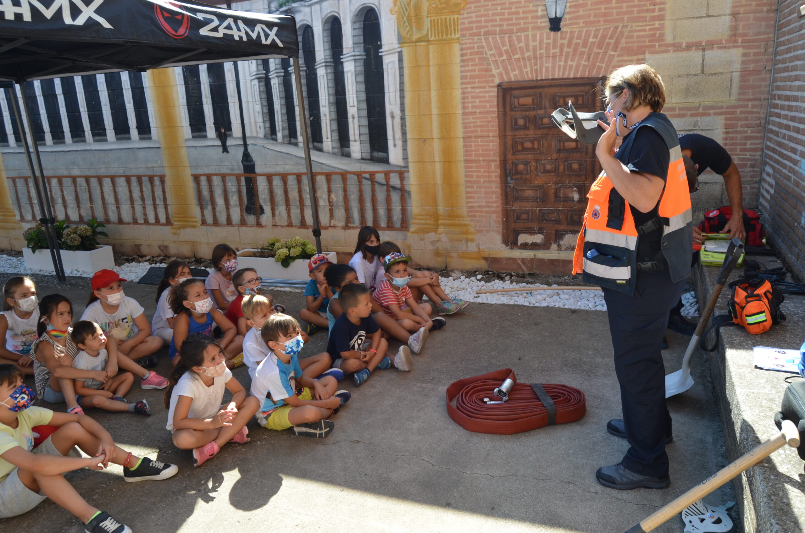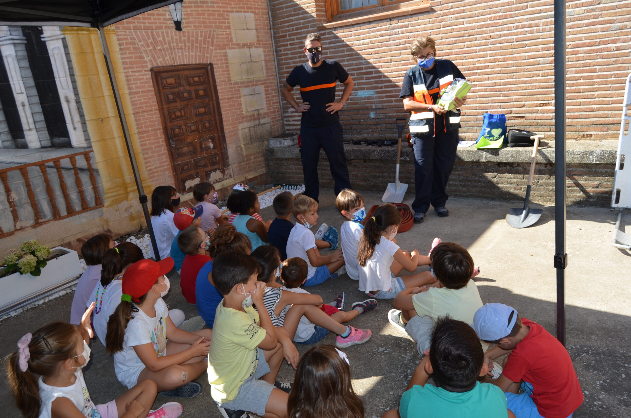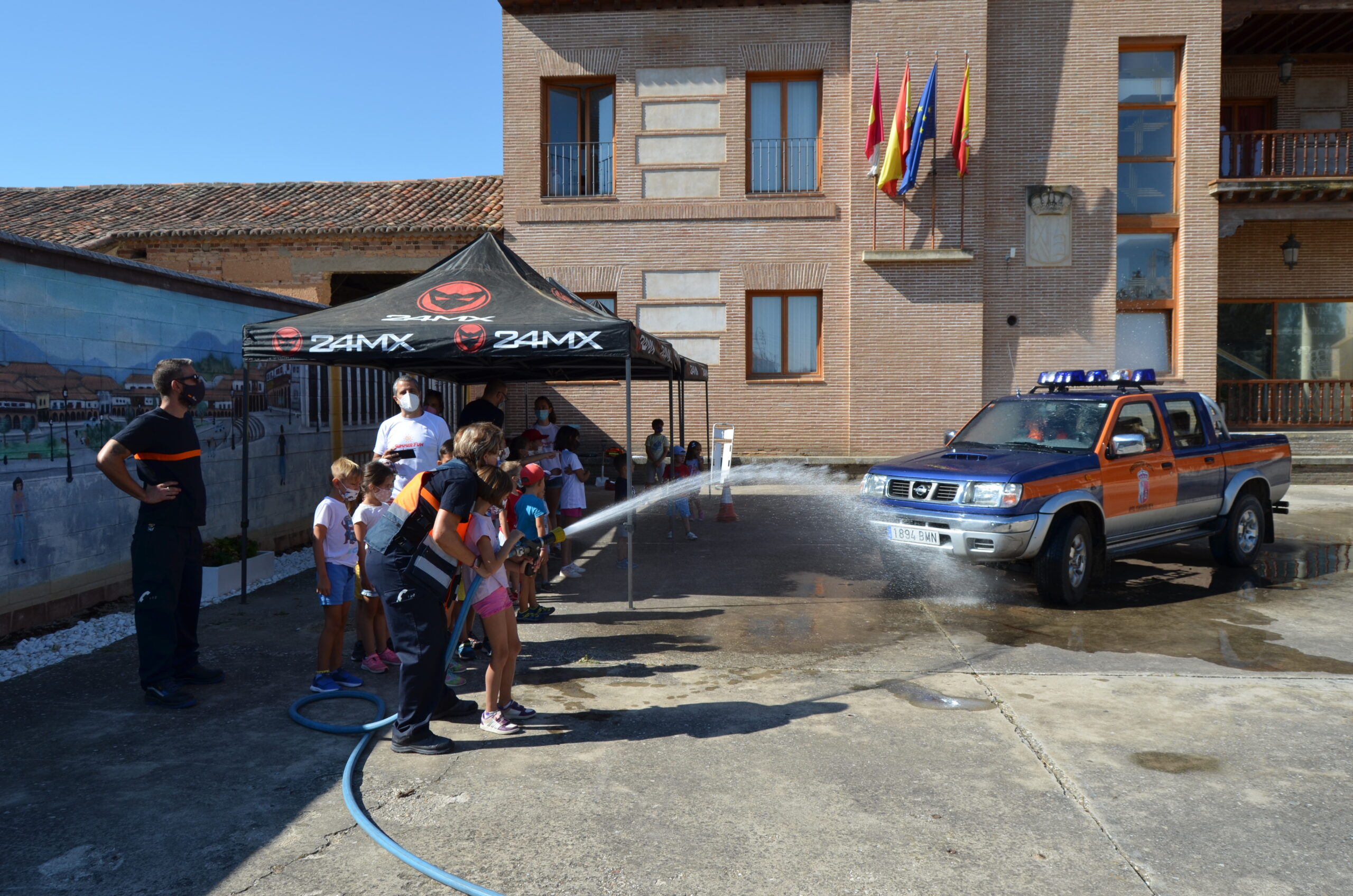 La visita comenzó con una muestra de la Agrupación Local de Voluntarios de Protección Civil, en la que les explicaron las diferentes funciones que realizan y les enseñaron el material que utilizan para ello. Así, aprovecharon una de sus mangueras de agua para refrescarse en la calurosa mañana.
