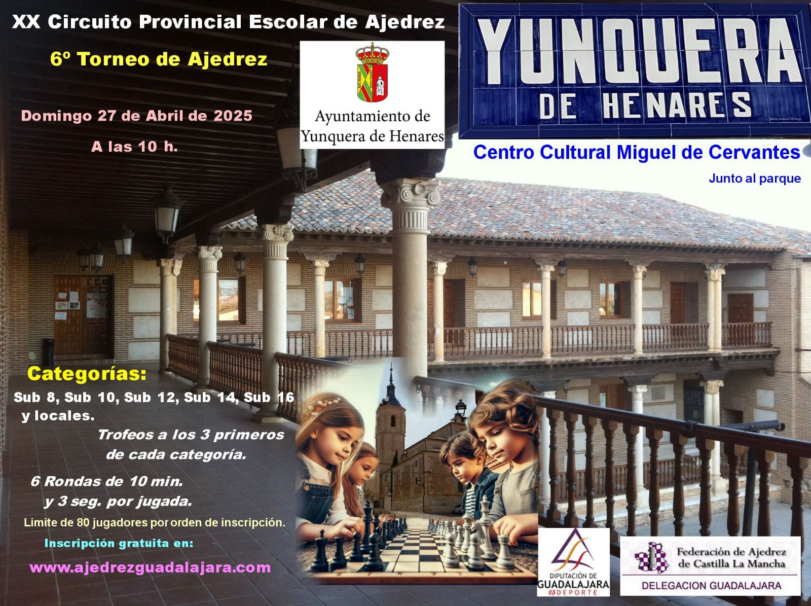 Este domingo 27 de abril, el Centro Cultural Miguel de Cervantes de Yunquera de Henares acoger谩 la sexta prueba del XX Circuito Provincial Escolar de Ajedrez, una cita imprescindible para los j贸venes talentos de la provincia.