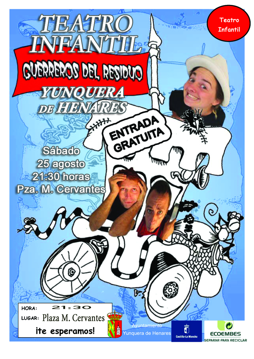 La campaña de sensibilización que la Junta de Comunidades de Castilla-La Mancha y Ecoembes han puesto en marcha para aumentar la eficacia de la recogida selectiva de envases, llega este sábado a Yunquera de Henares con la reperesentación de la obra “Guerreros del Residuo” a cargo de la Compañía de Teatro Deliríca. Esta tendra lugar en la Plaza de Miguel de Cervantes, junto al Centro Cultural, a partir de las 21:30 horas y será de carácter gratuito.