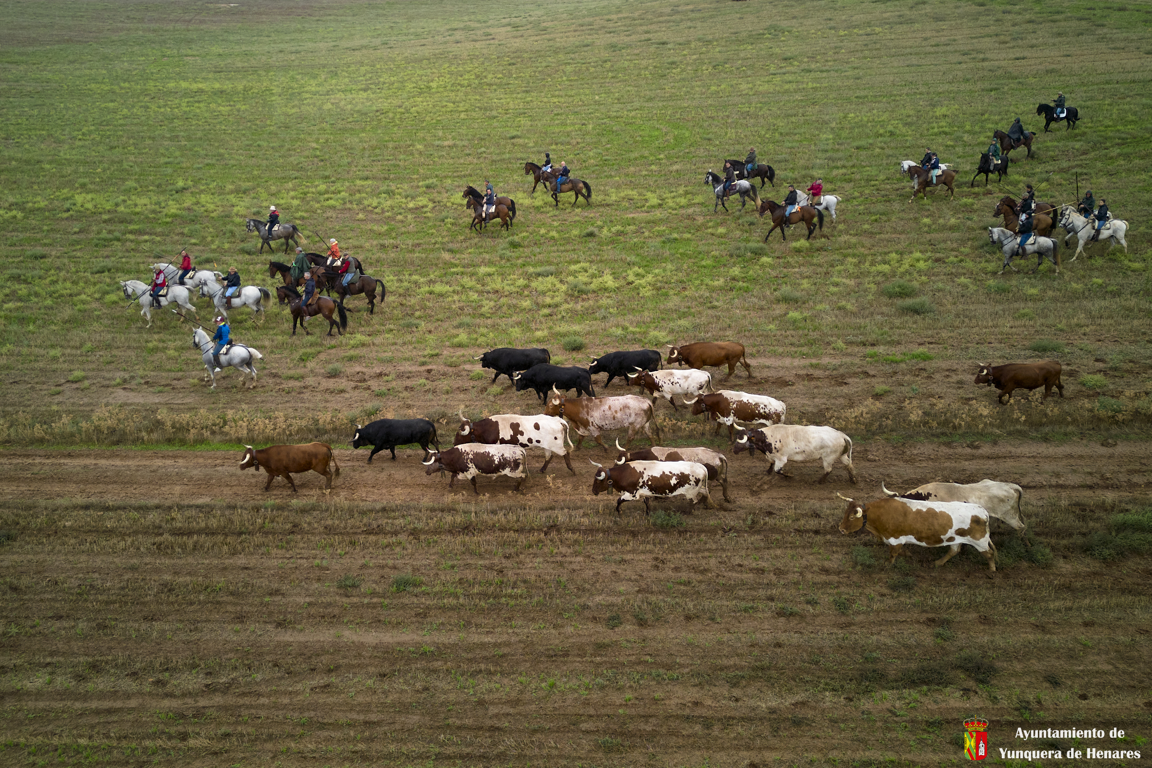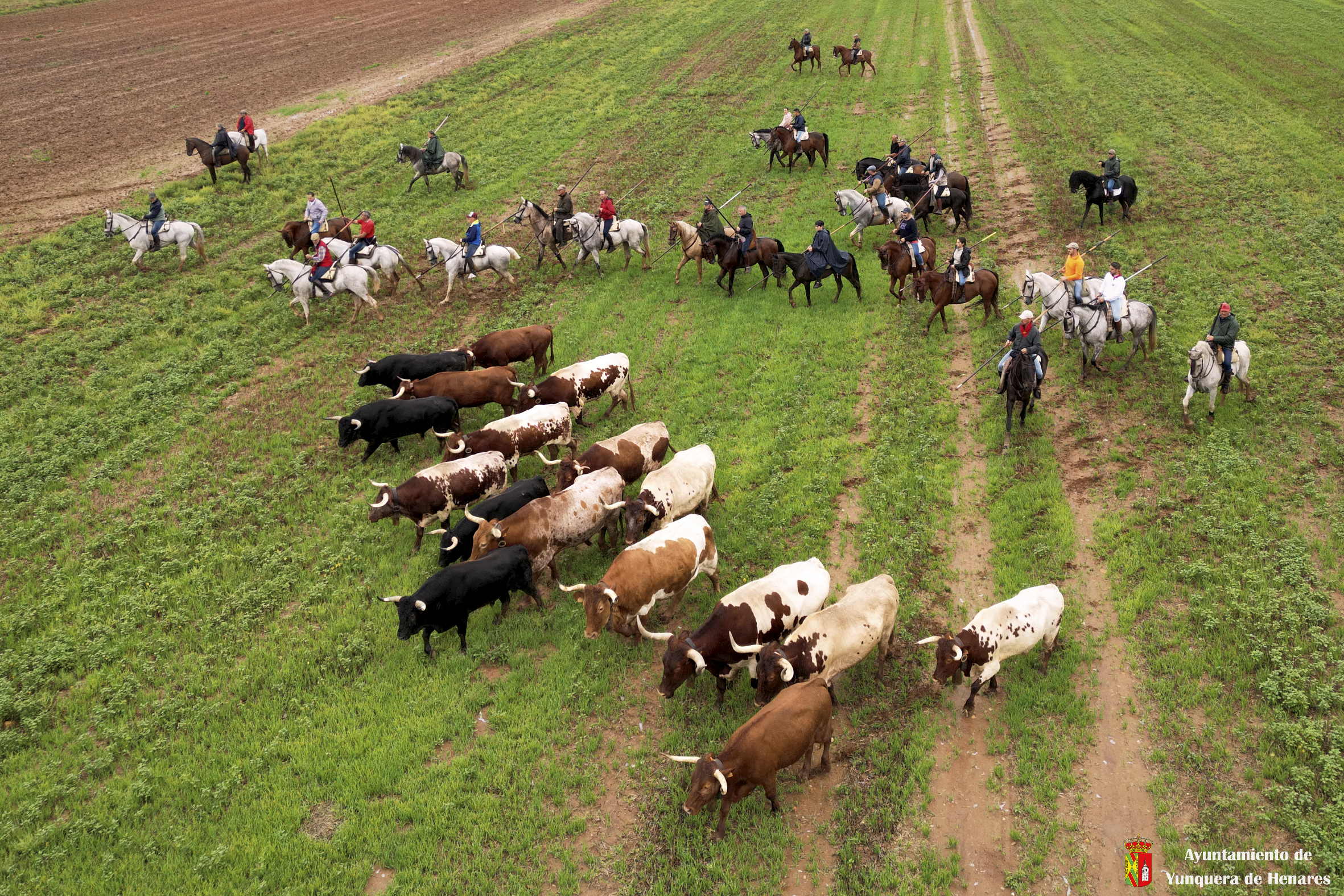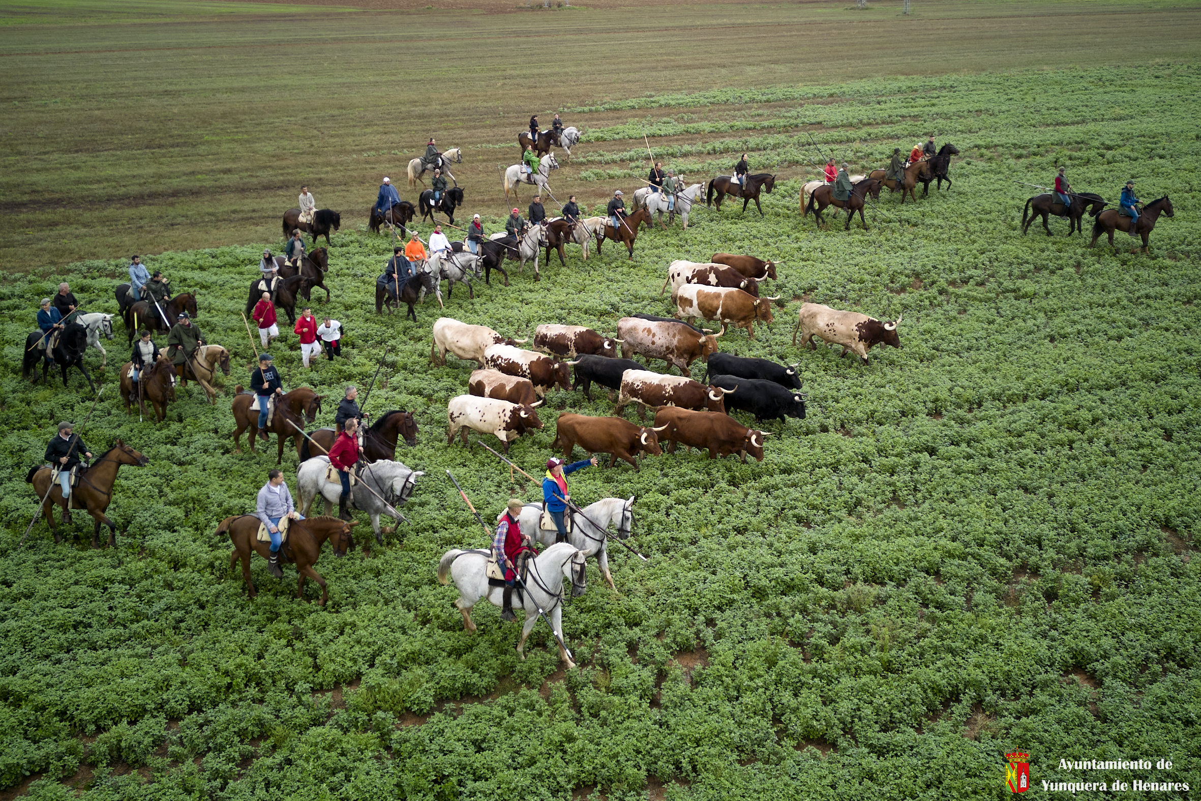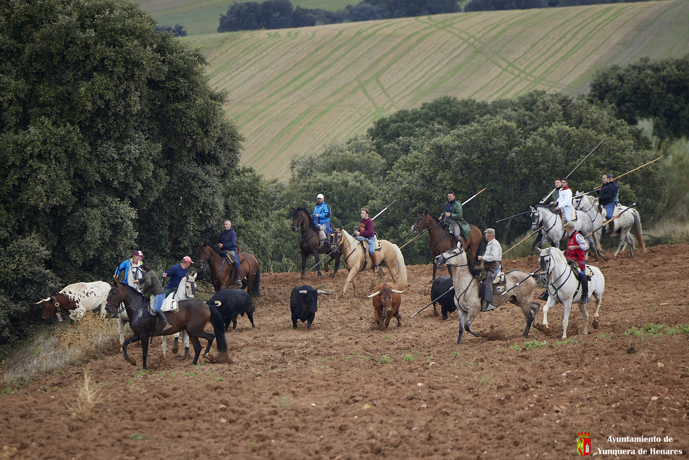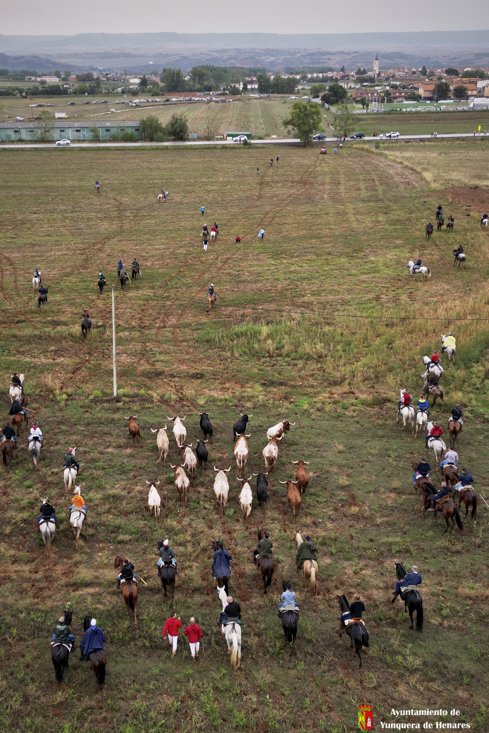 A pocos metros del canal del Henares se produce otro de los momentos especiales de la Bajada cuando ganadera y caballistas aceleran el ritmo para que los toros entren en las calles de Yunquera y se den las carreras de camino a la Plaza de Toros.