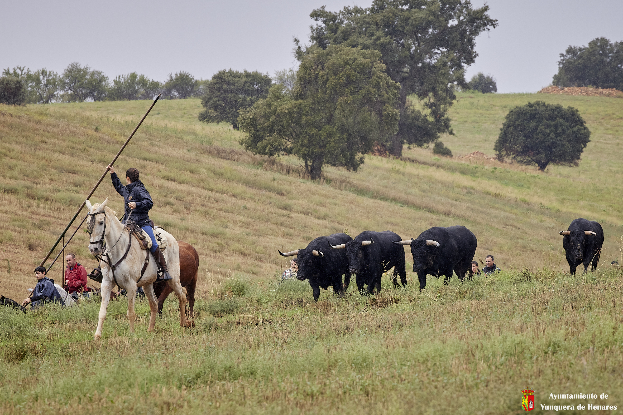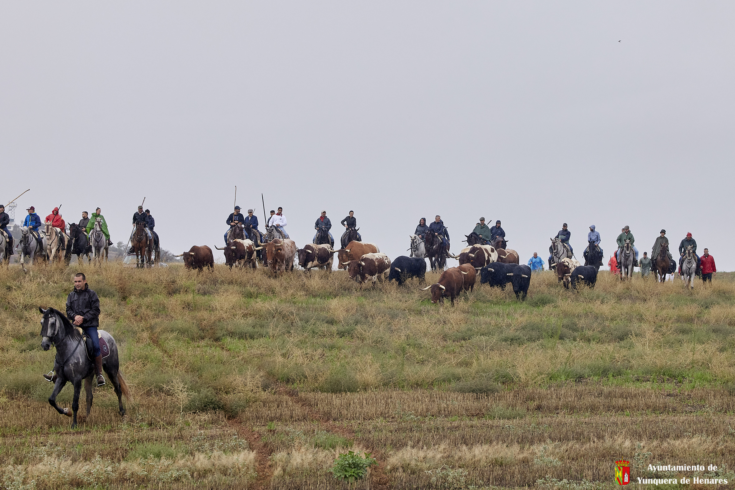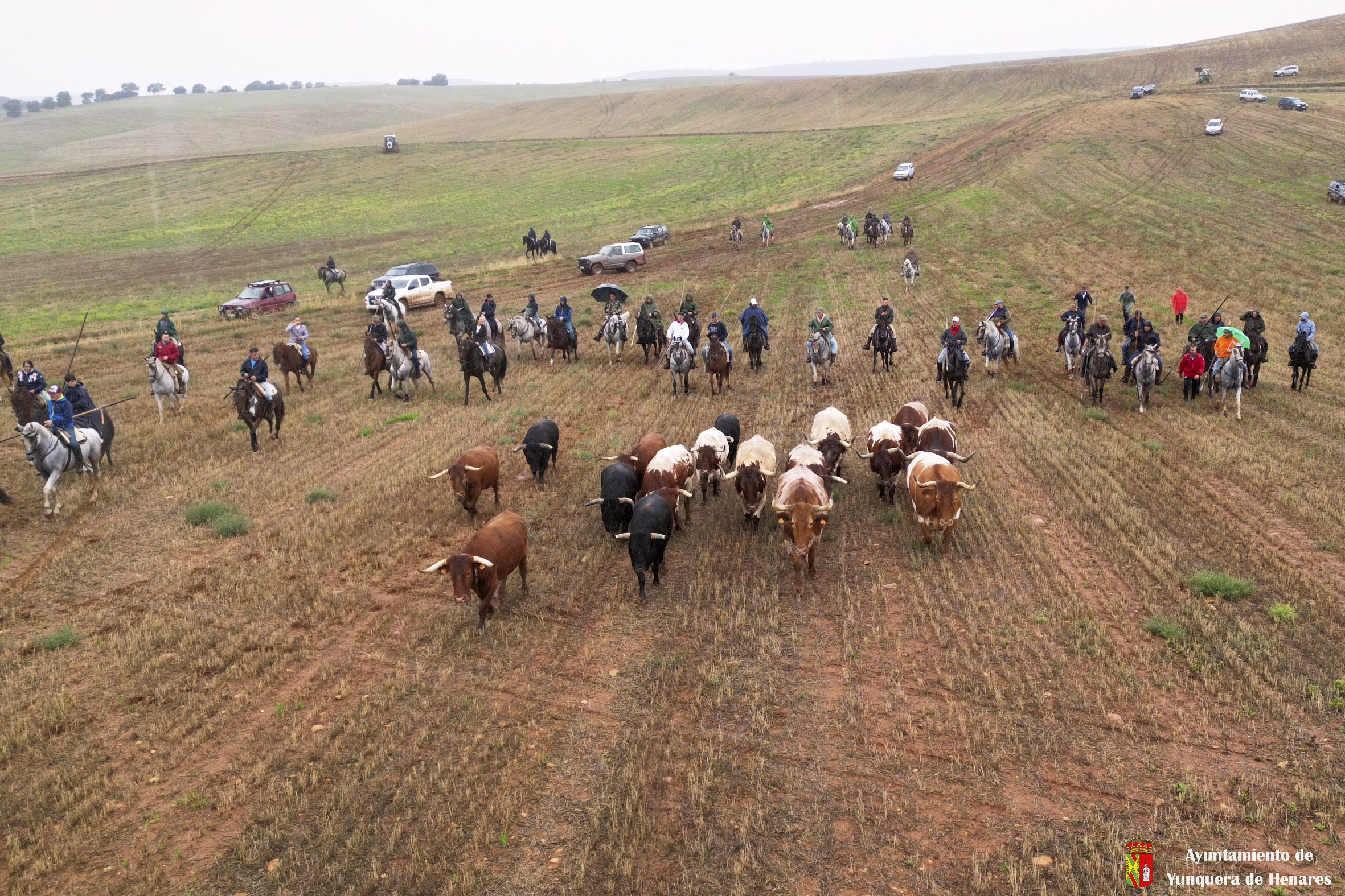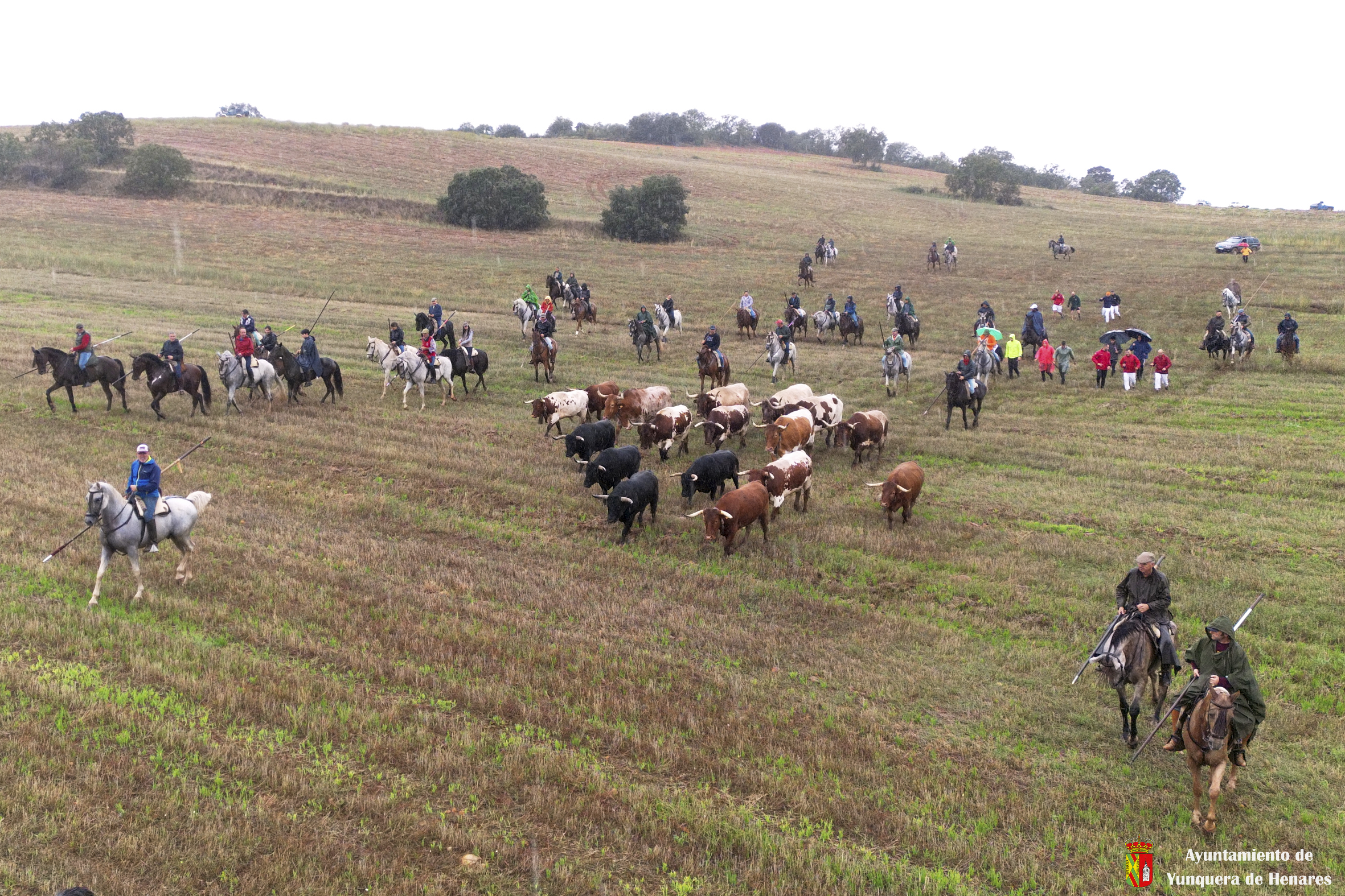 La tradicional Bajada de Yunquera de Henares se ha celebrado con normalidad a pesar de la lluvia. En torno a las diez y media de la mañana salían los utreros de la ganadería de Sandra Sopeña junto a bueyes y caballistas camino de la Plaza de toros de «Las Traviesas».