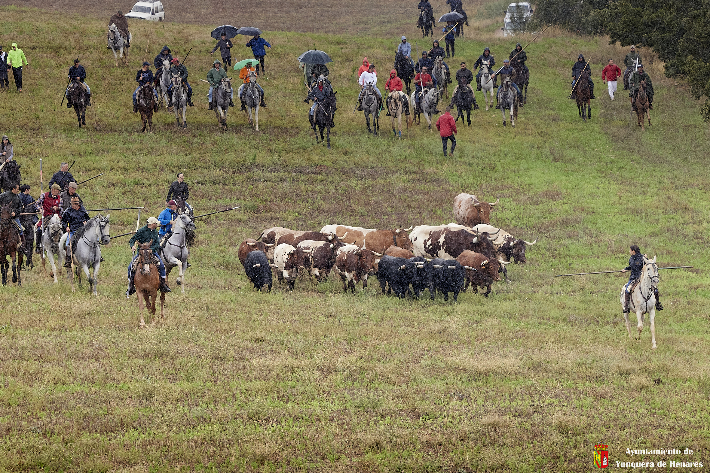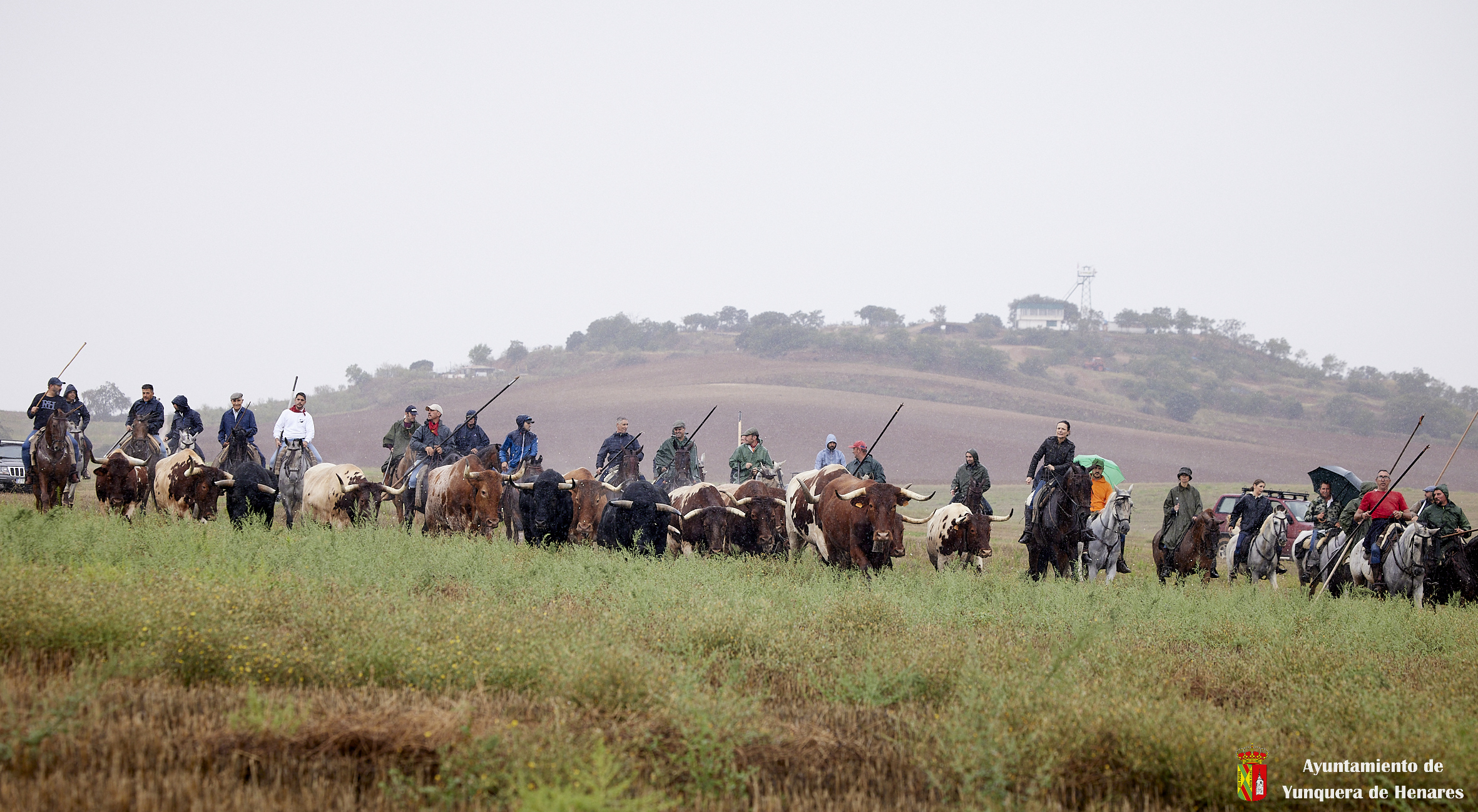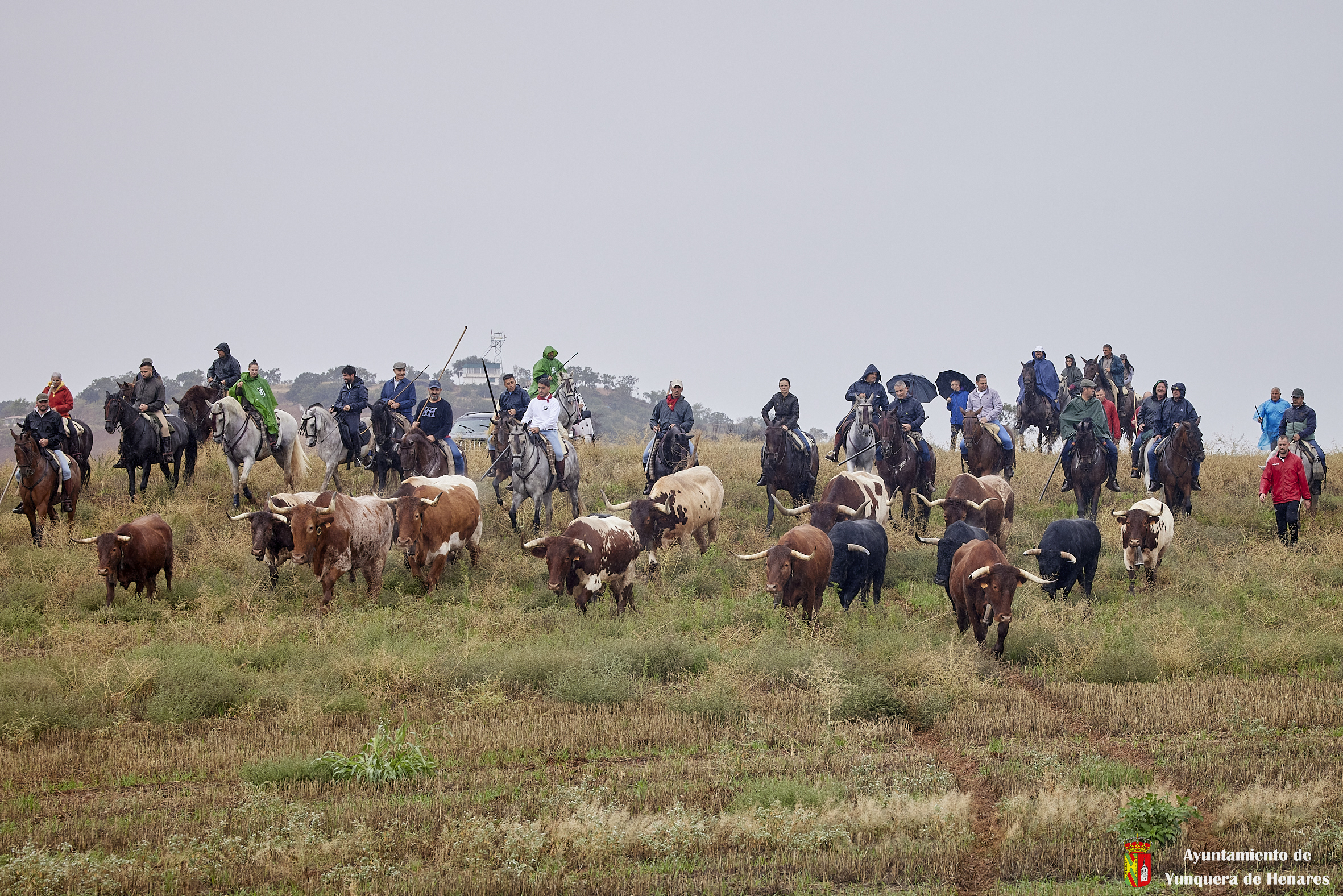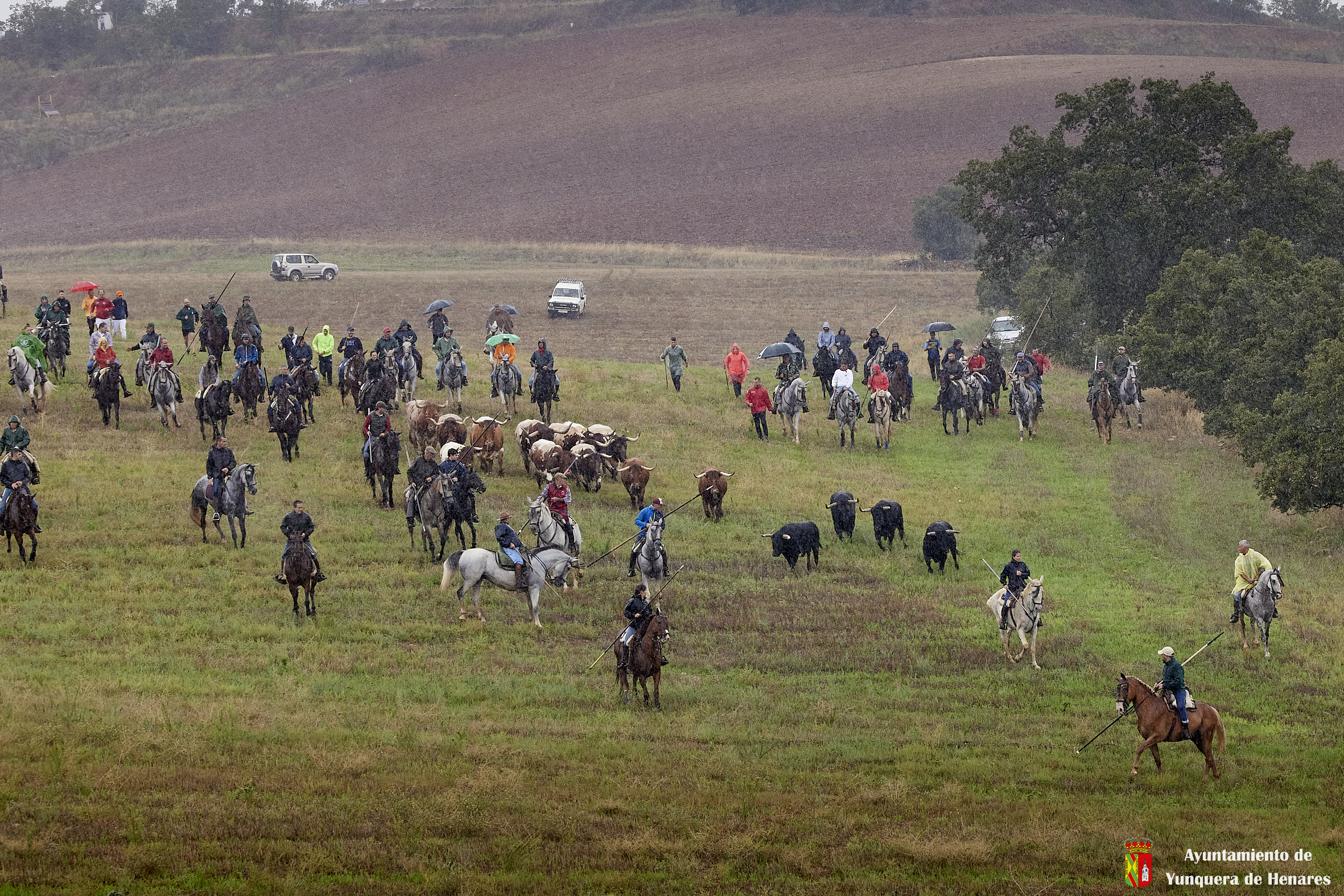 La tradicional Bajada de Yunquera de Henares se ha celebrado con normalidad a pesar de la lluvia. En torno a las diez y media de la mañana salían los utreros de la ganadería de Sandra Sopeña junto a bueyes y caballistas camino de la Plaza de toros de «Las Traviesas».