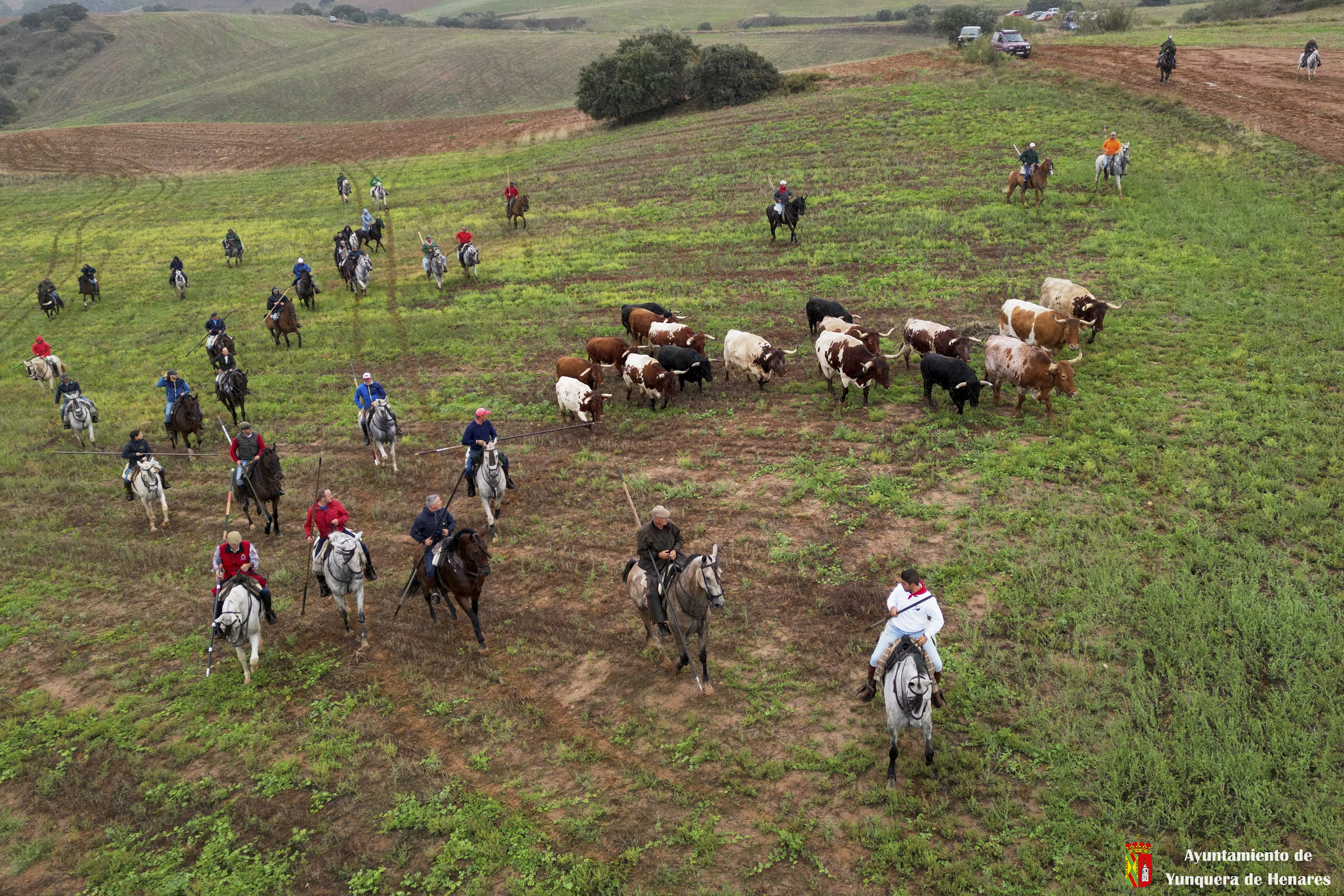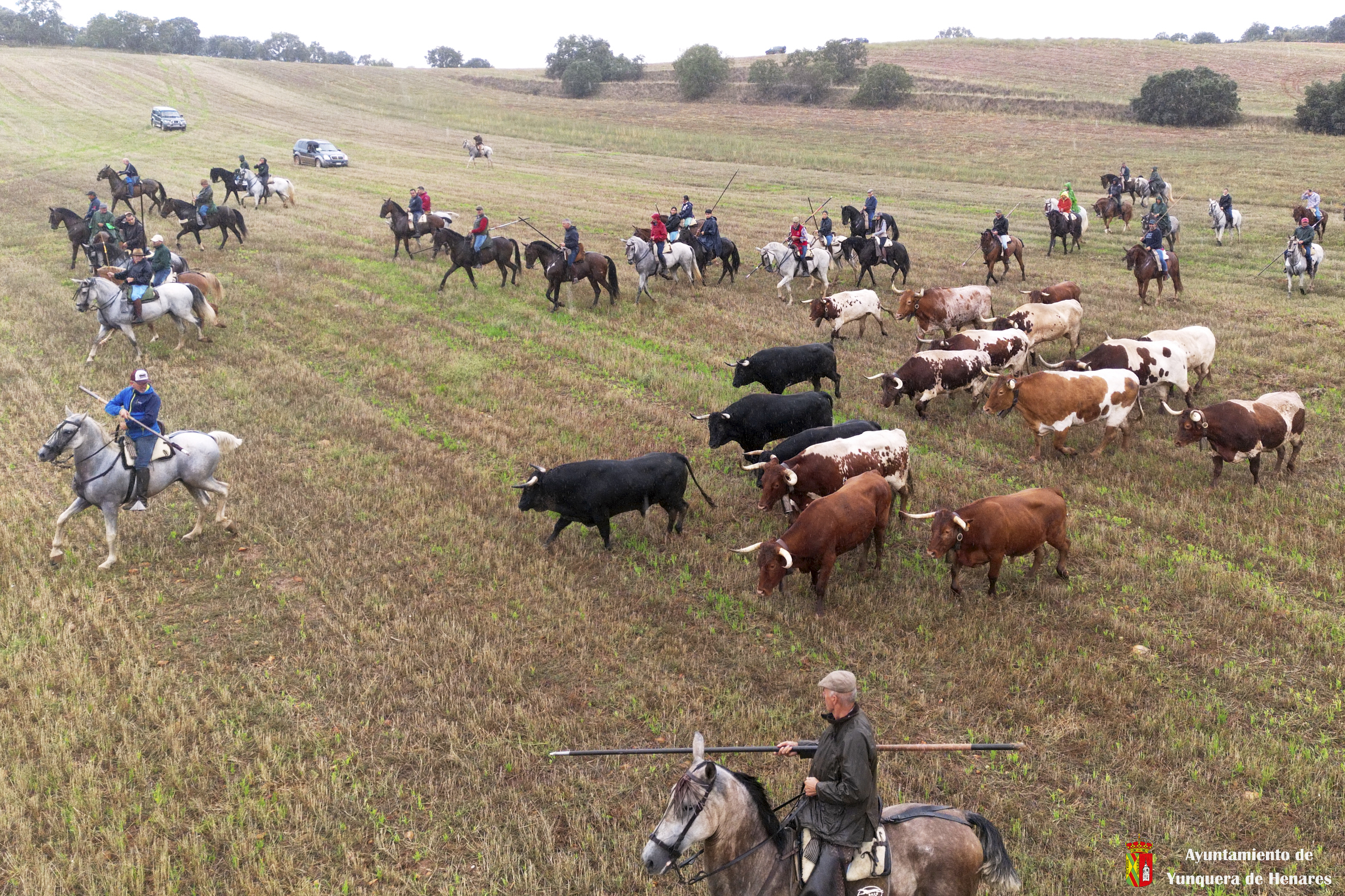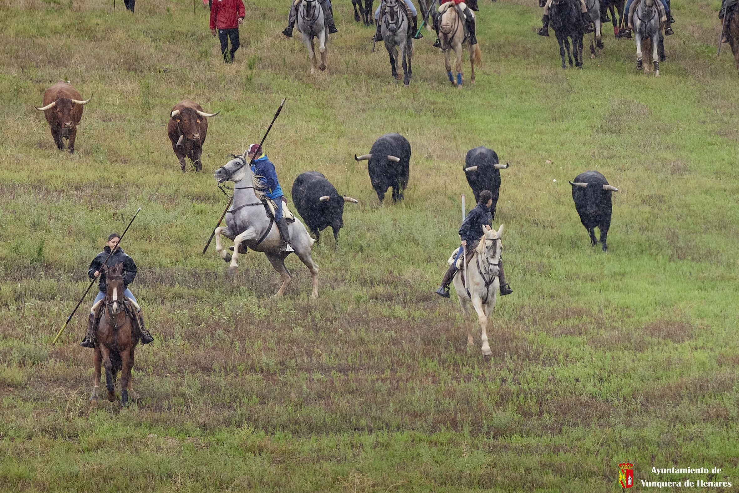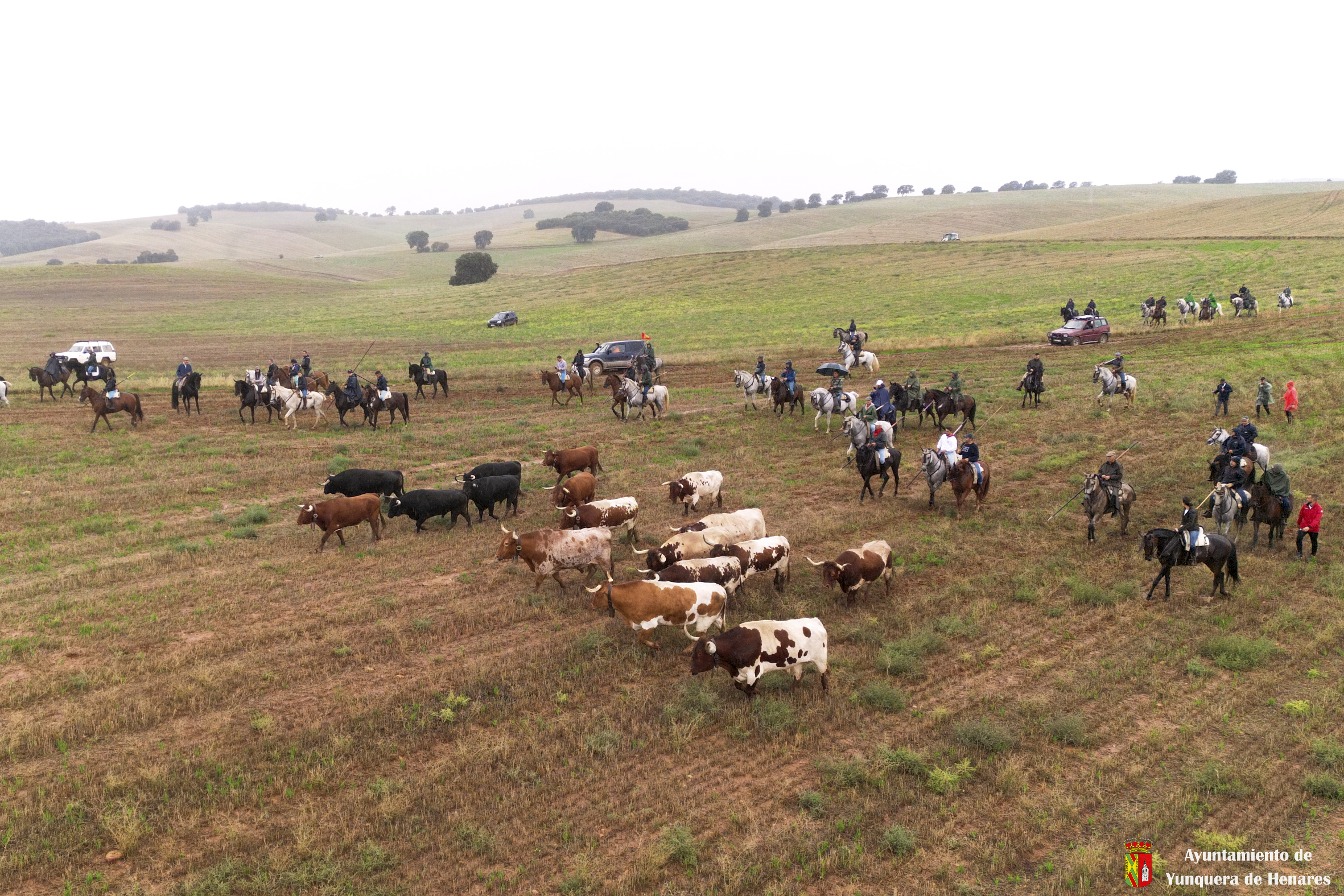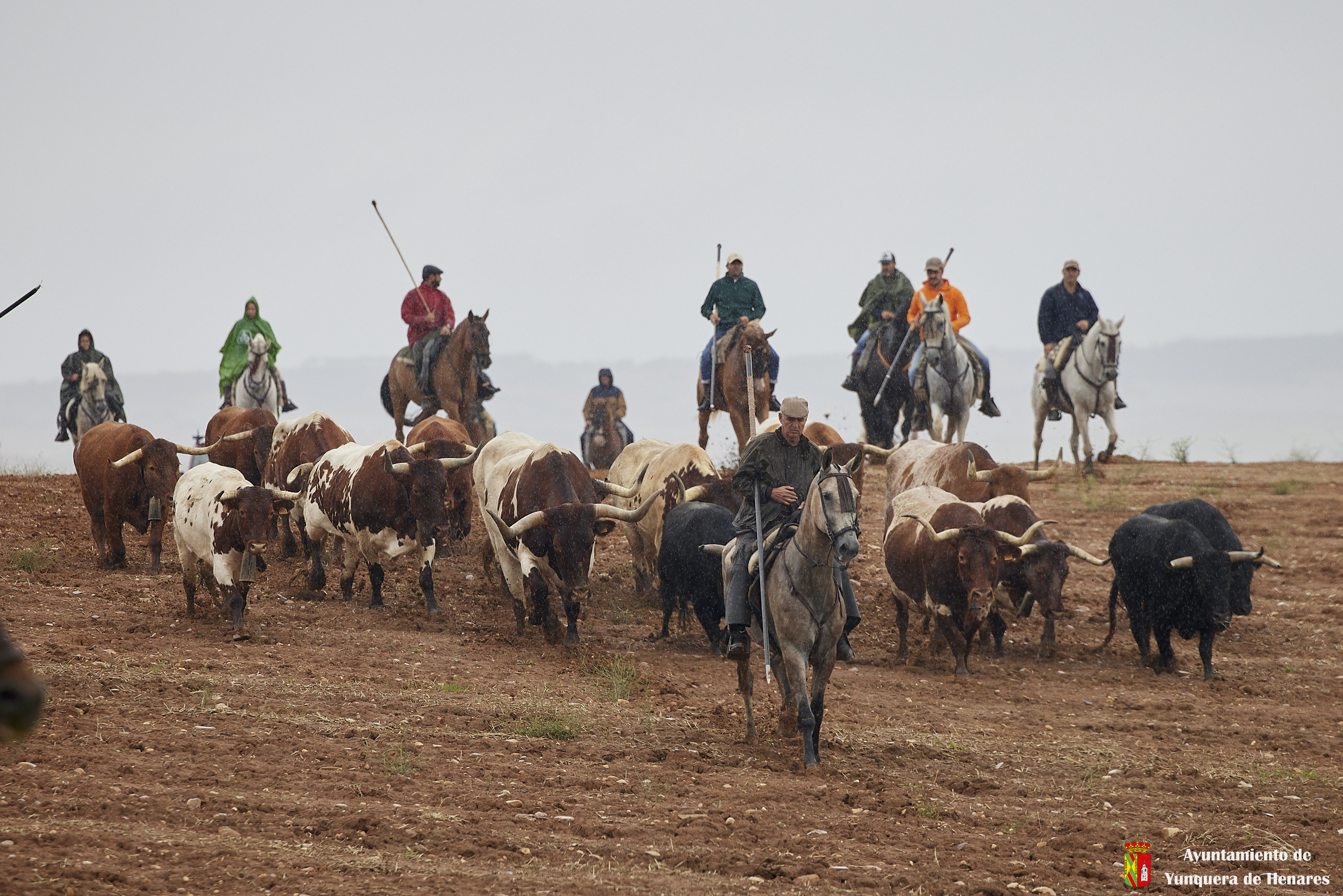 La tradicional Bajada de Yunquera de Henares se ha celebrado con normalidad a pesar de la lluvia. En torno a las diez y media de la mañana salían los utreros de la ganadería de Sandra Sopeña junto a bueyes y caballistas camino de la Plaza de toros de «Las Traviesas».