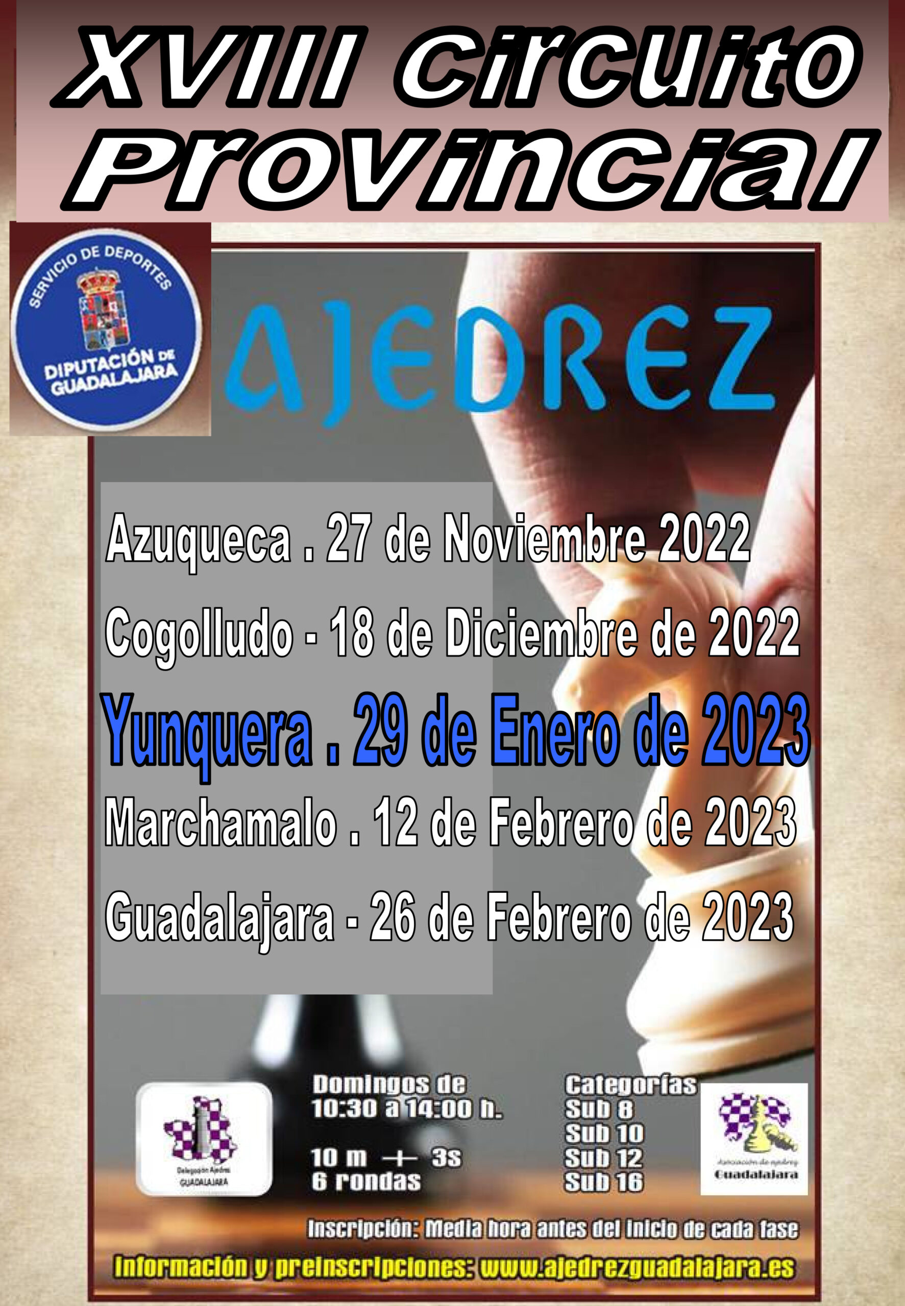 El Circuito provincial de Ajedrez Escolar realizará su tercera parada en Yunquera de Henares el próximo 29 de enero, después de pasar por las localidades de Azuqueca y Cogolludo. Este campeonato tiene como finalidad la promoción del ajedrez entre los escolares y recorrerá 5 municipios de la provincia. Está patrocinado por la Diputación Provincial de Guadalajara y organizado por la Delegación Provincial de la Federación de Ajedrez de CLM.