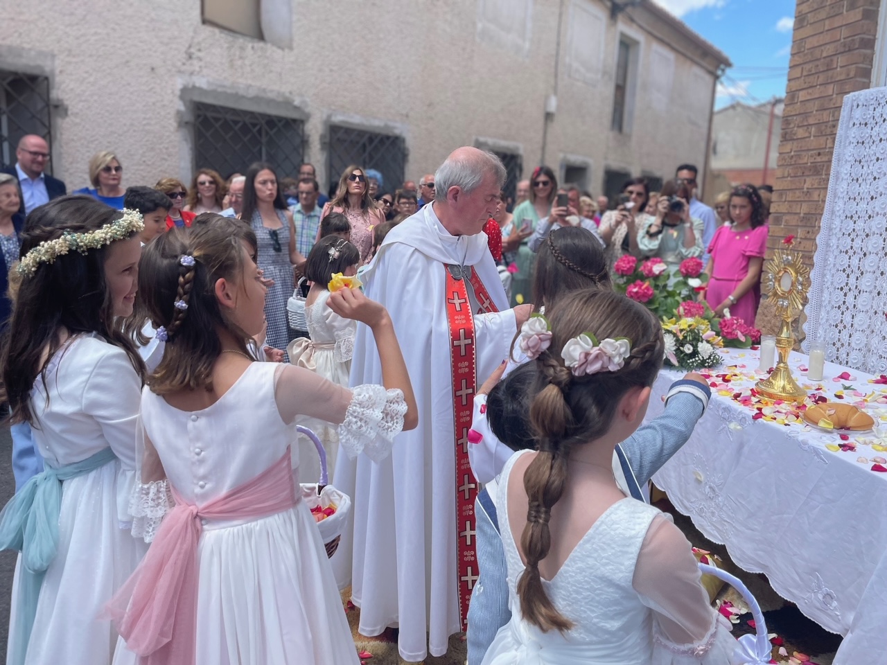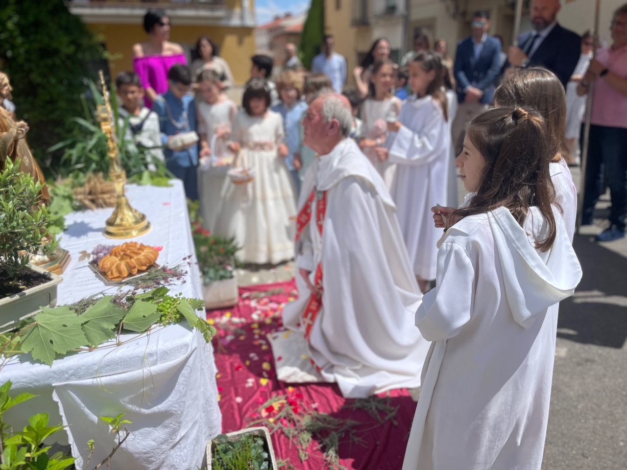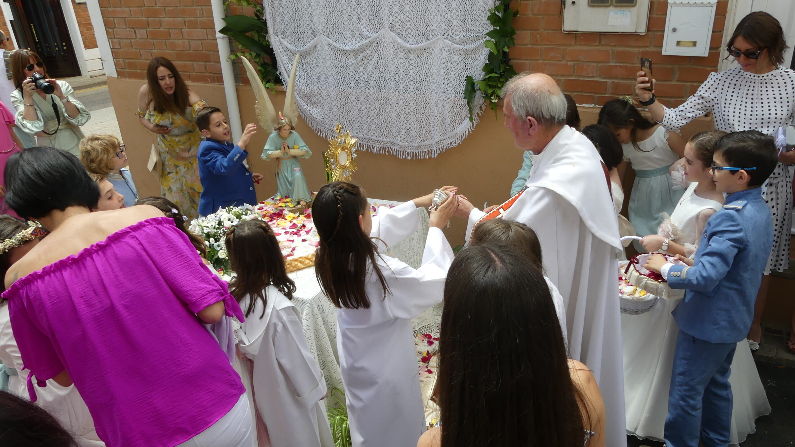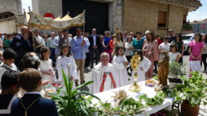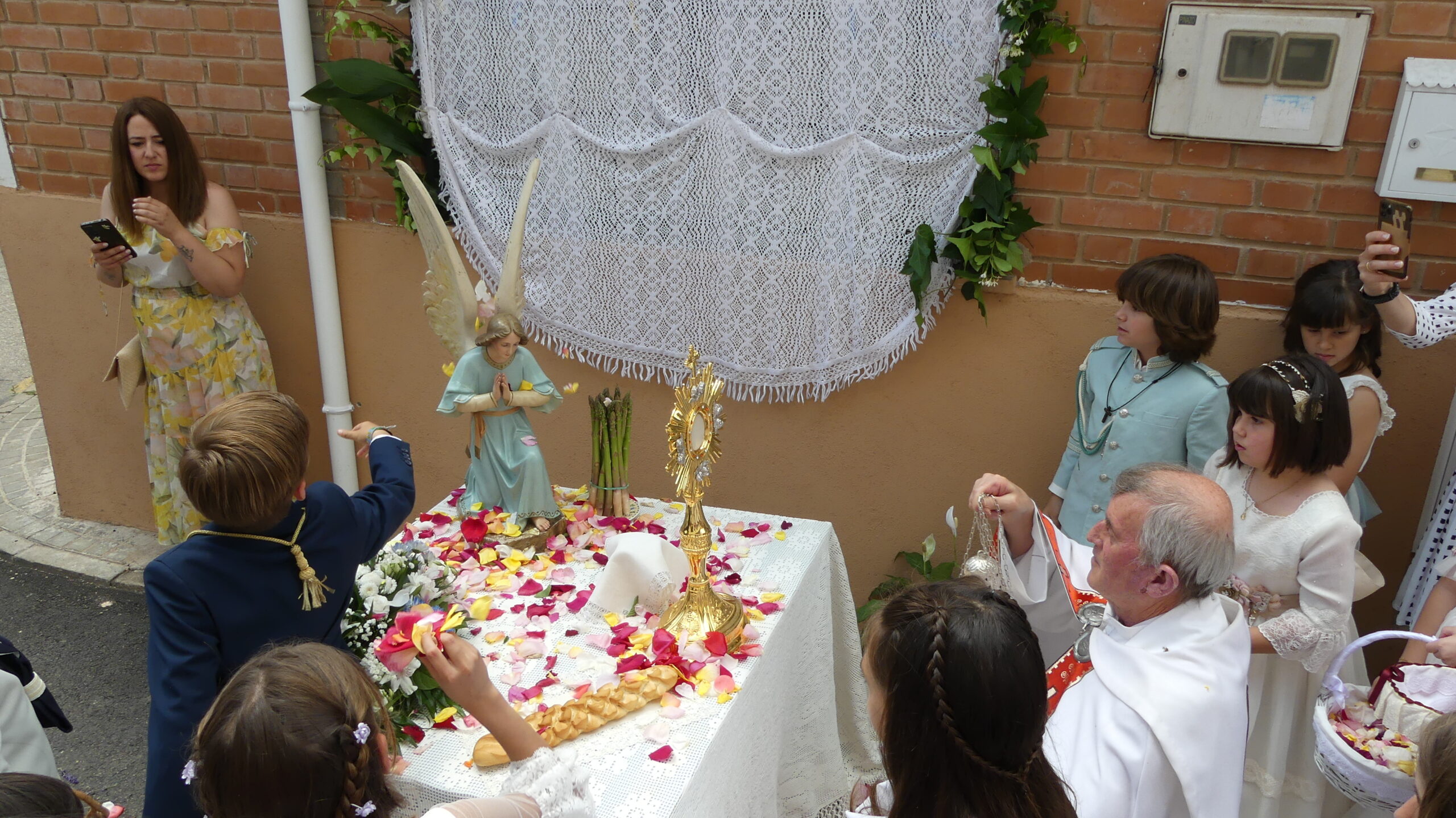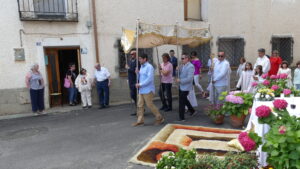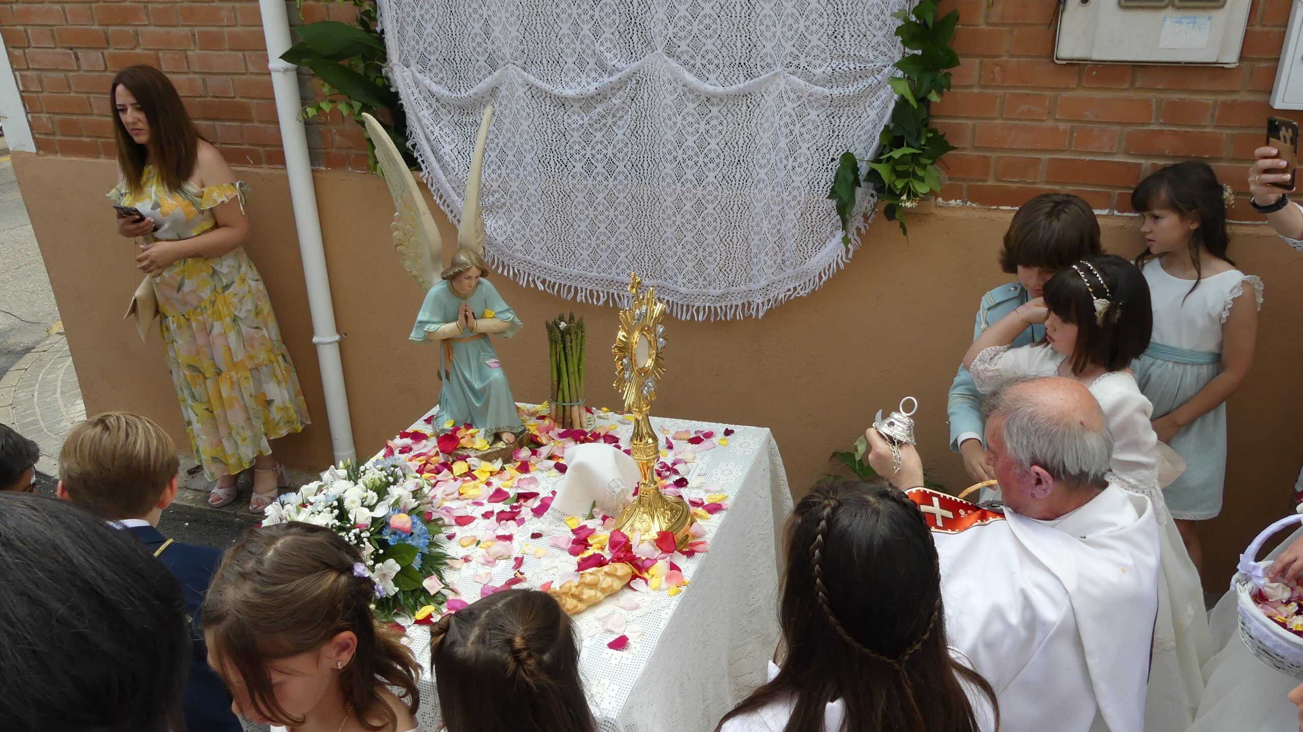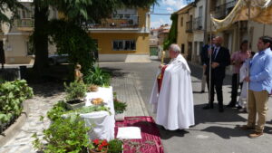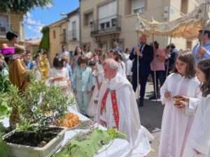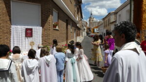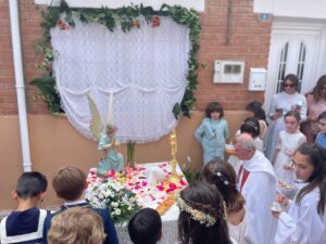 Este año han sido cuatro los altares que se han confeccionado en el recorrido de la procesión. En cada uno de ellos el párroco ha realizado la oración correspondiente y los niños han entregado pétalos a cada uno de los altares.