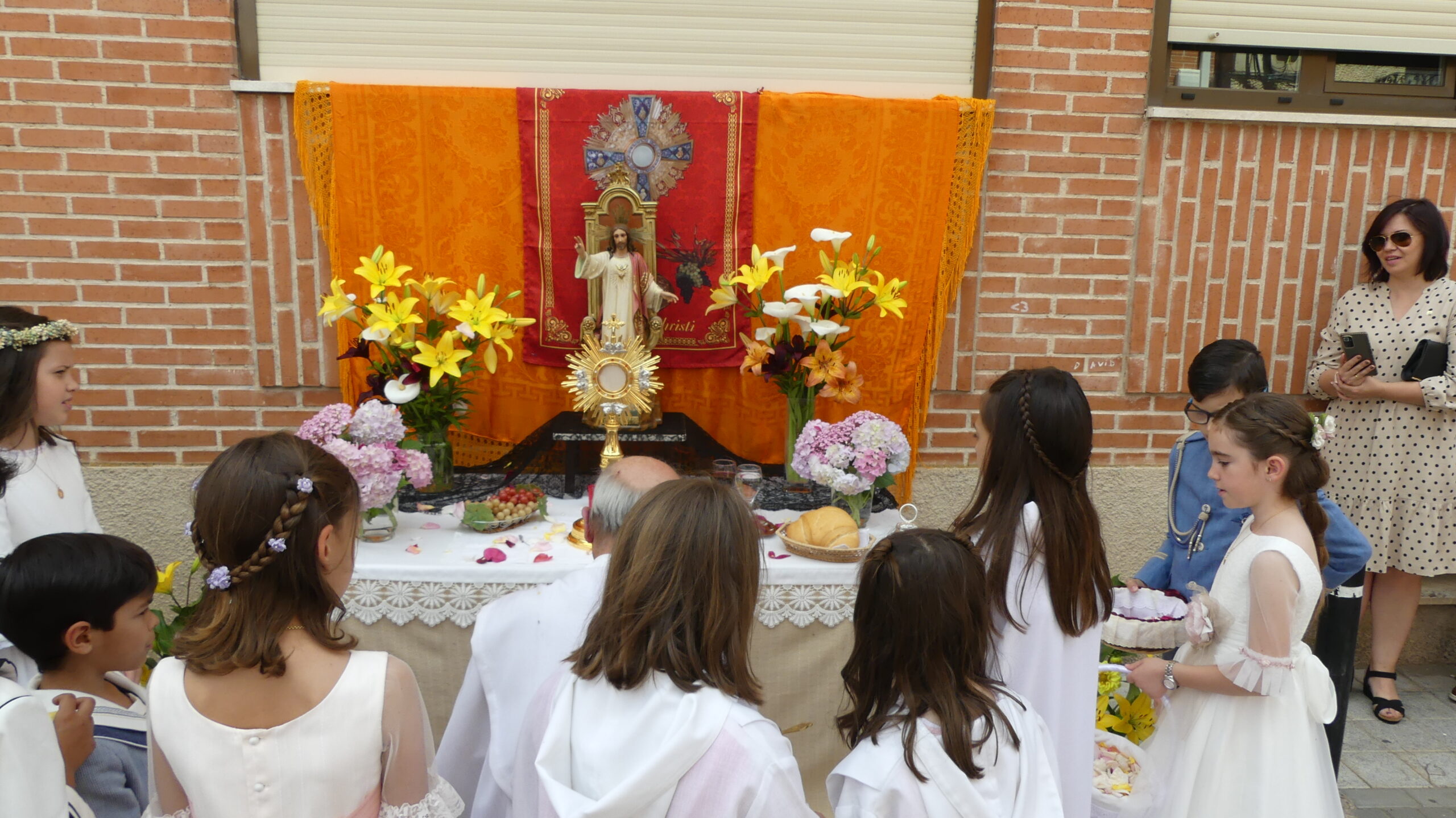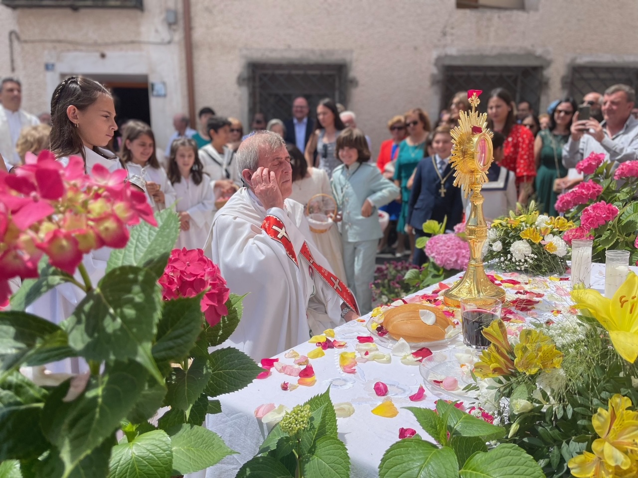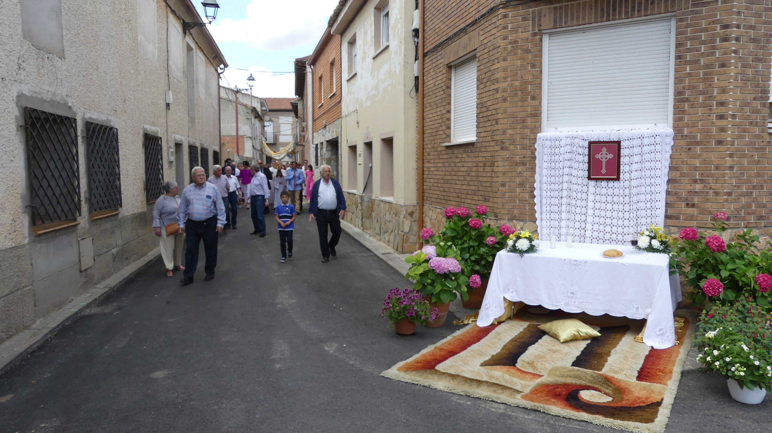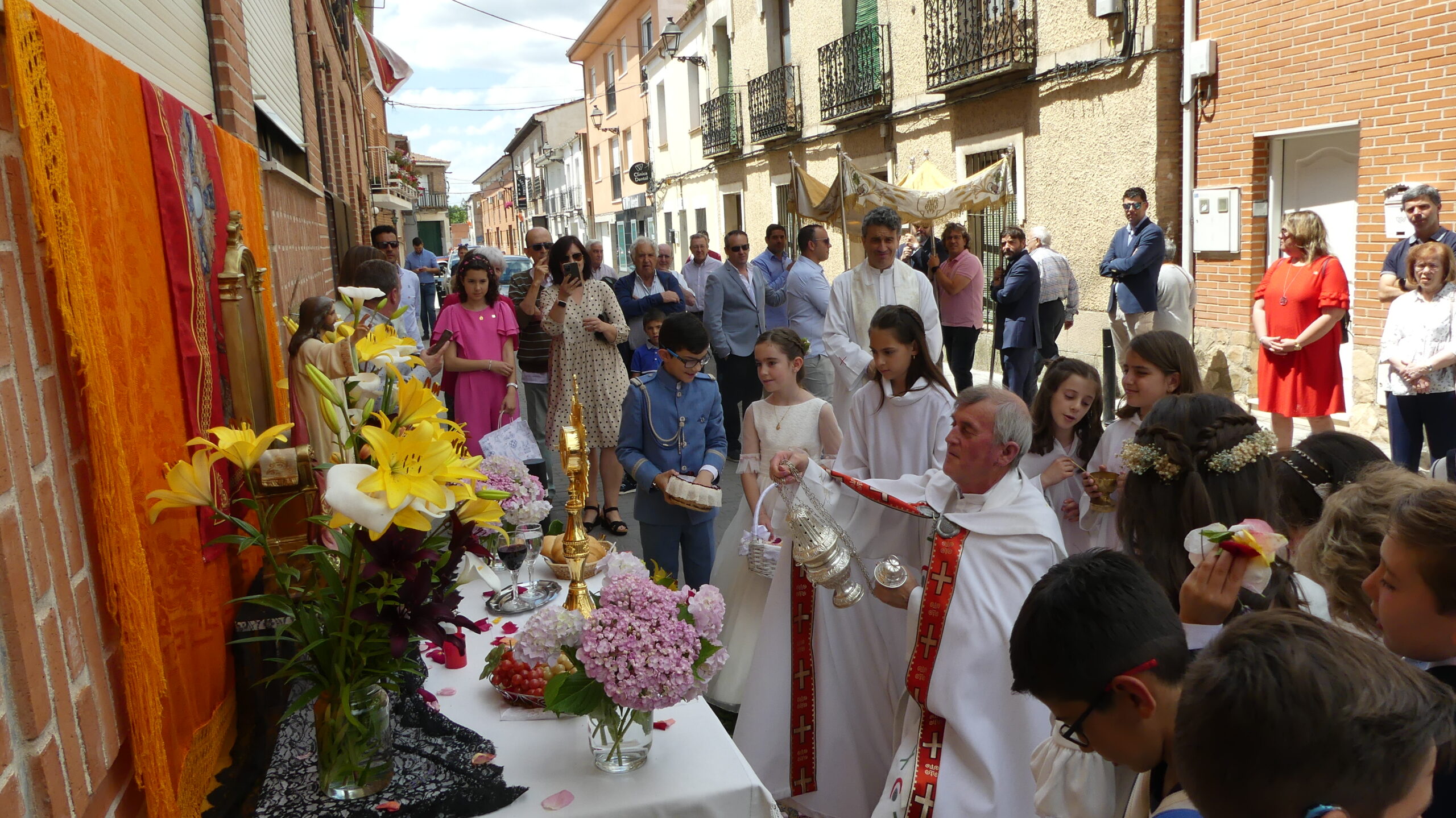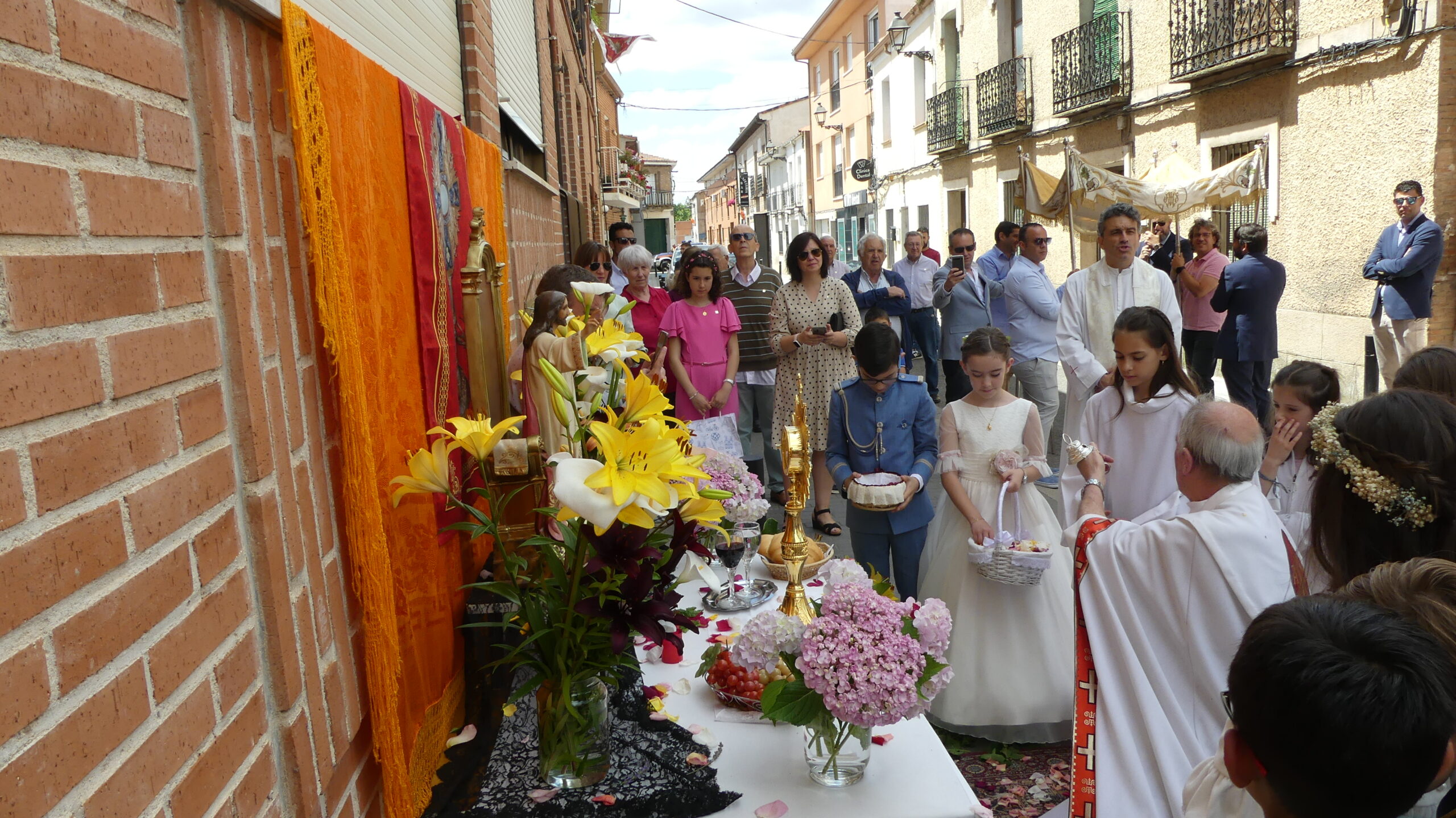 Este año han sido cuatro los altares que se han confeccionado en el recorrido de la procesión. En cada uno de ellos el párroco ha realizado la oración correspondiente y los niños han entregado pétalos a cada uno de los altares.