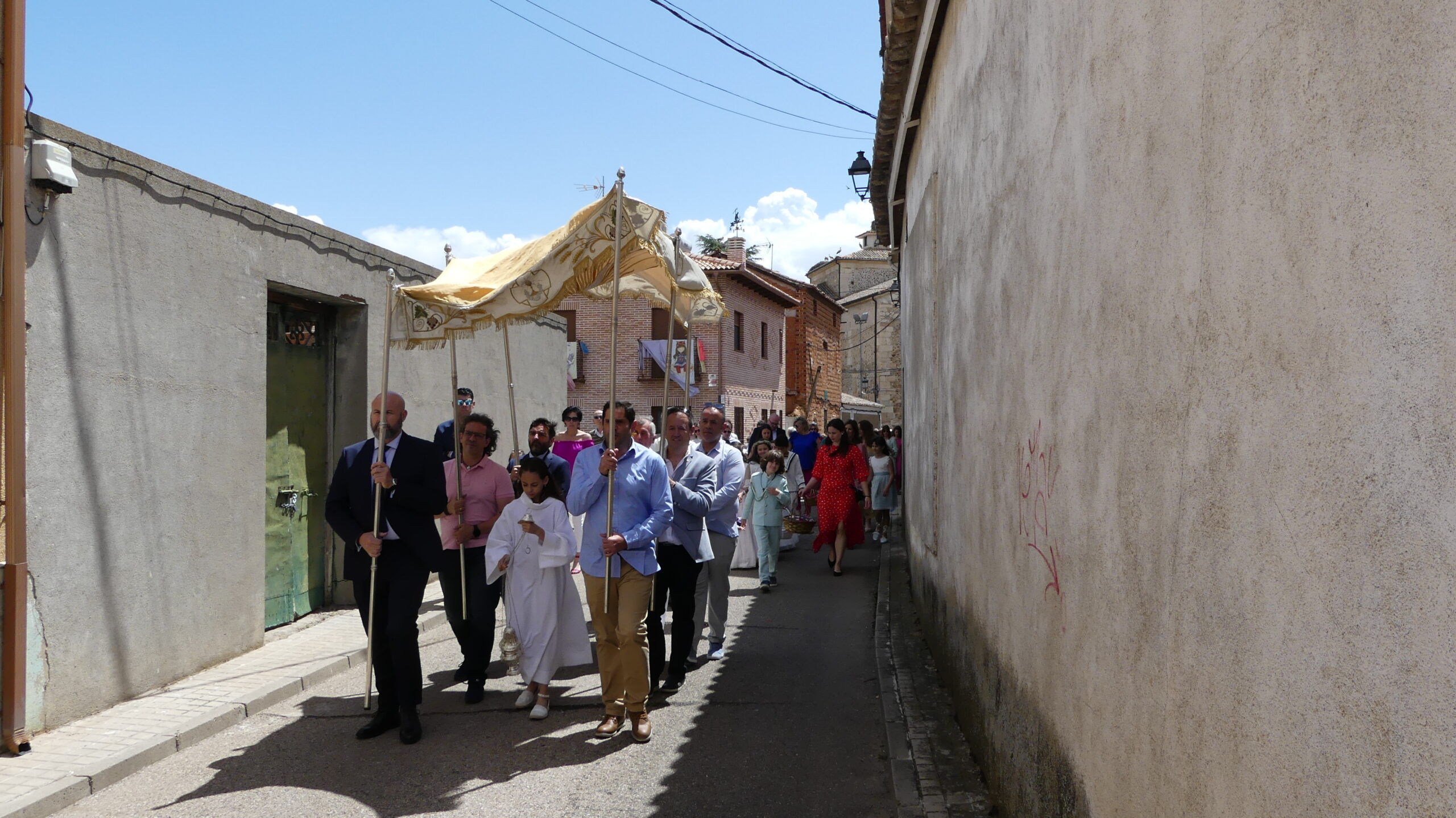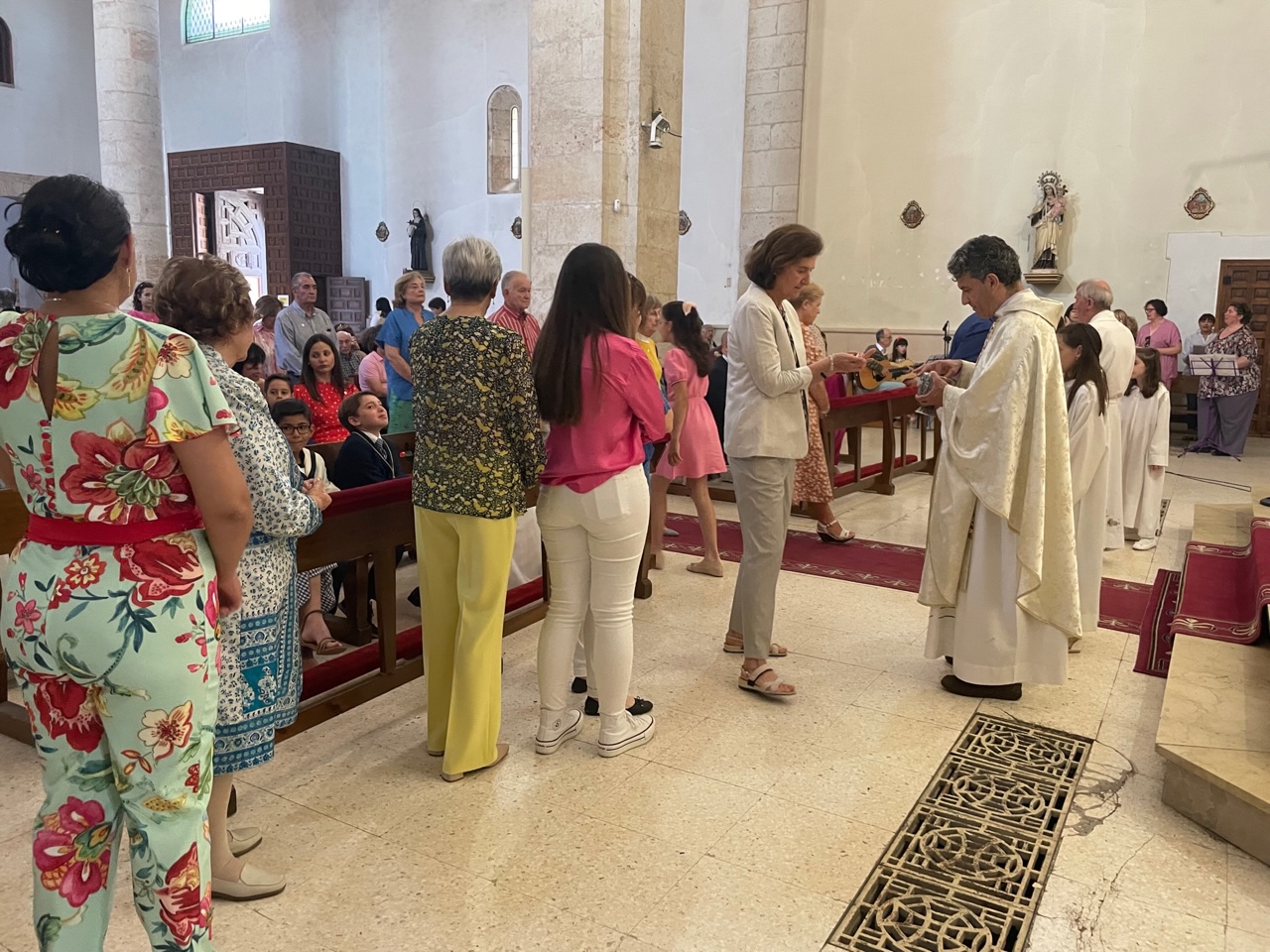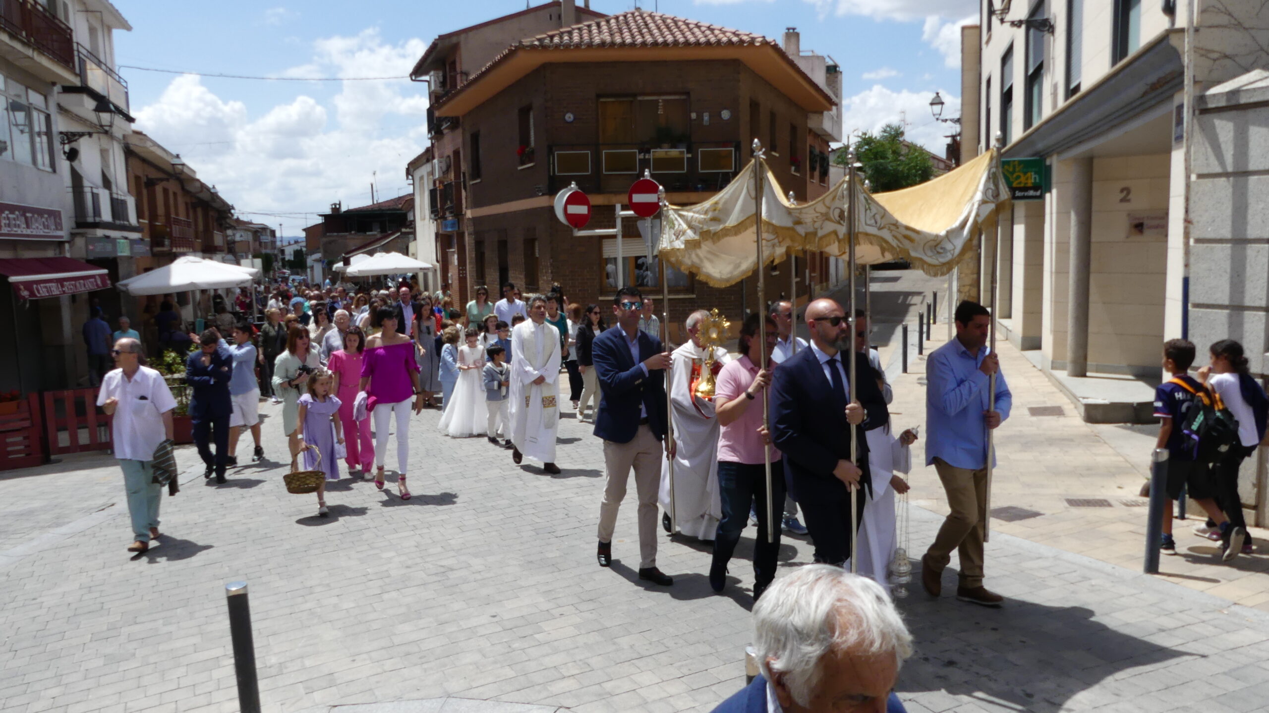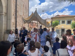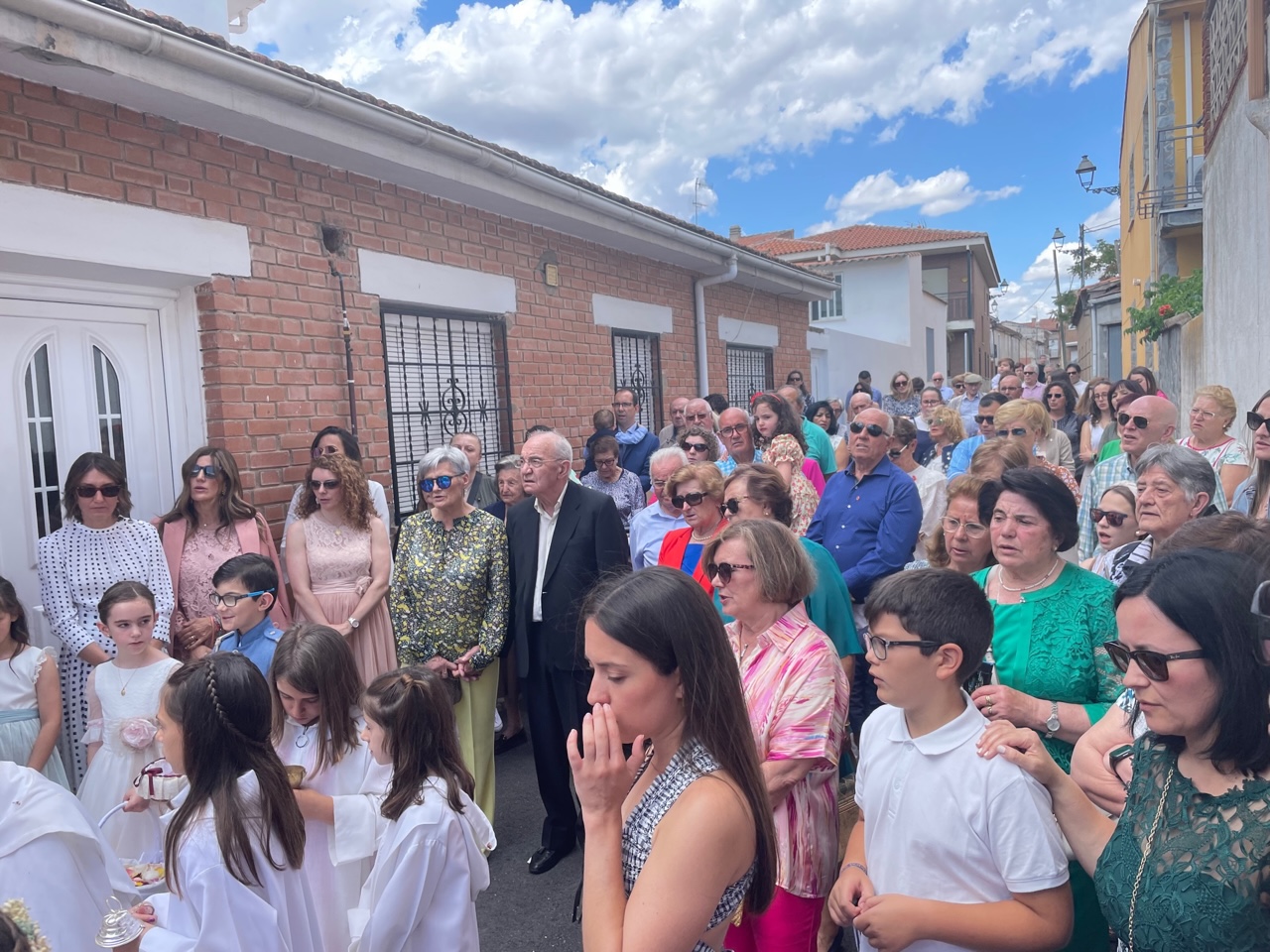 El Corpus ha concluido con la vuelta a la iglesia en la que los niños de la Comunión han vaciado sus cestas de pétalos en la puerta del templo mientras entraba la Custodia del Santísimo.