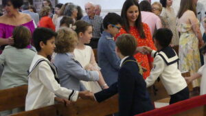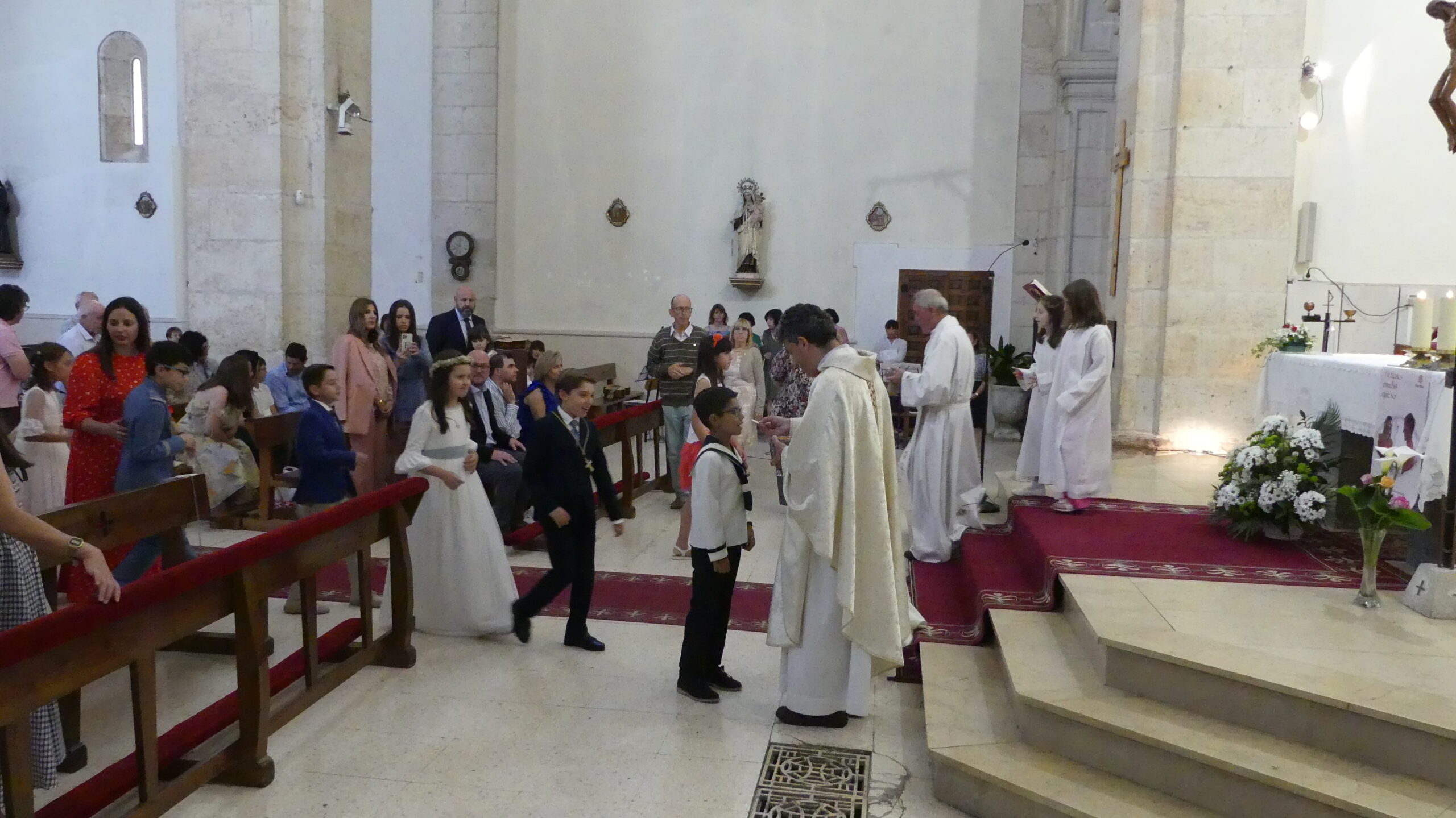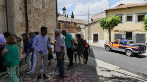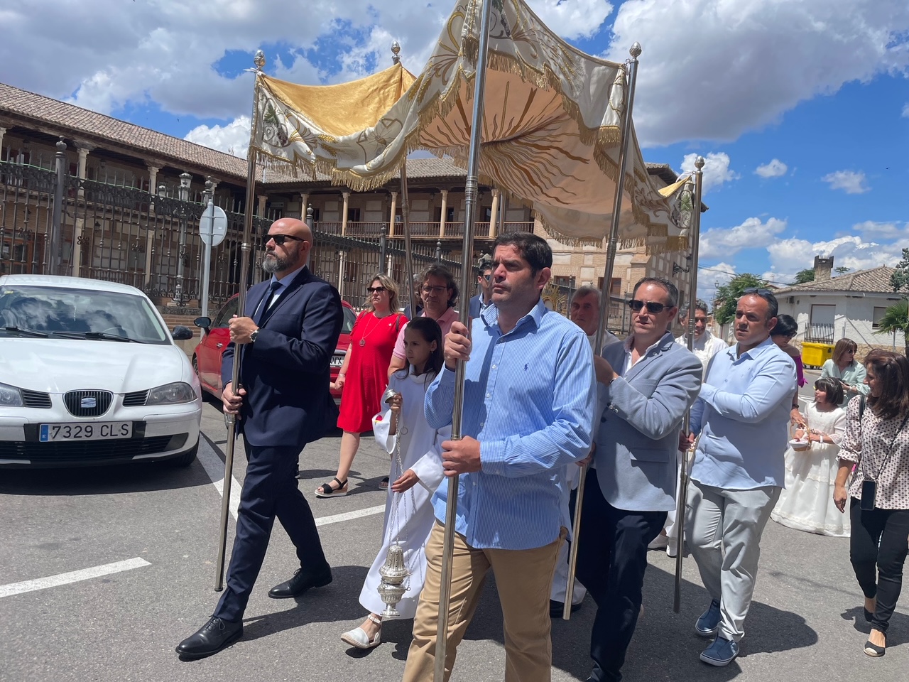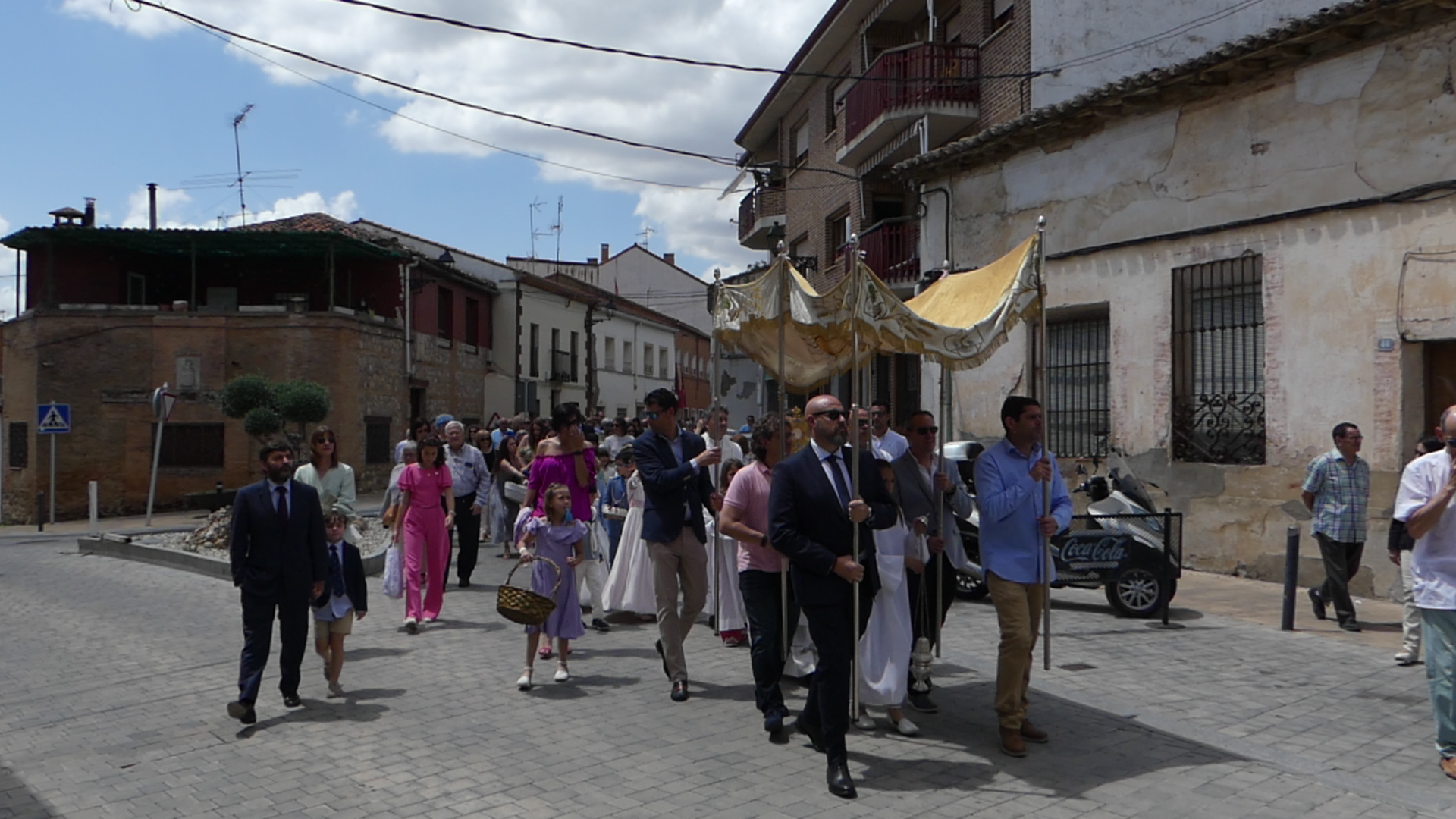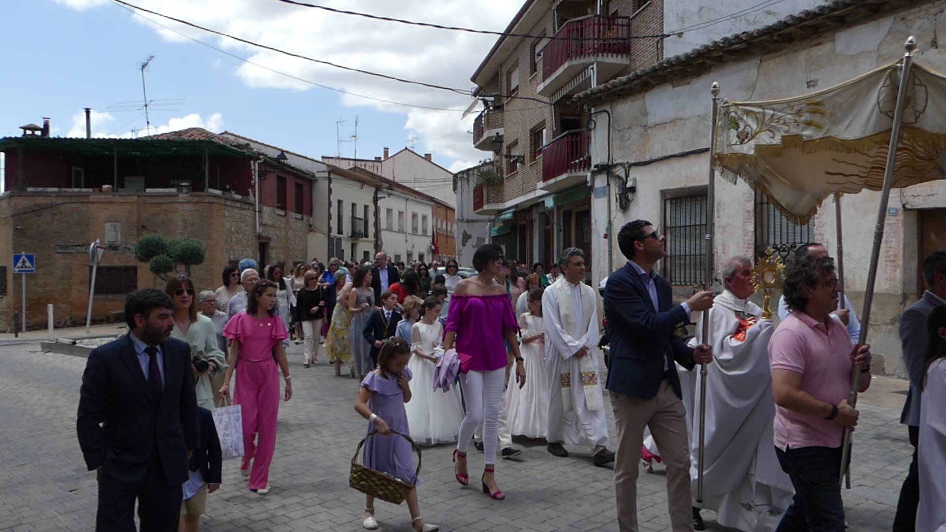 El Corpus ha concluido con la vuelta a la iglesia en la que los niños de la Comunión han vaciado sus cestas de pétalos en la puerta del templo mientras entraba la Custodia del Santísimo.
