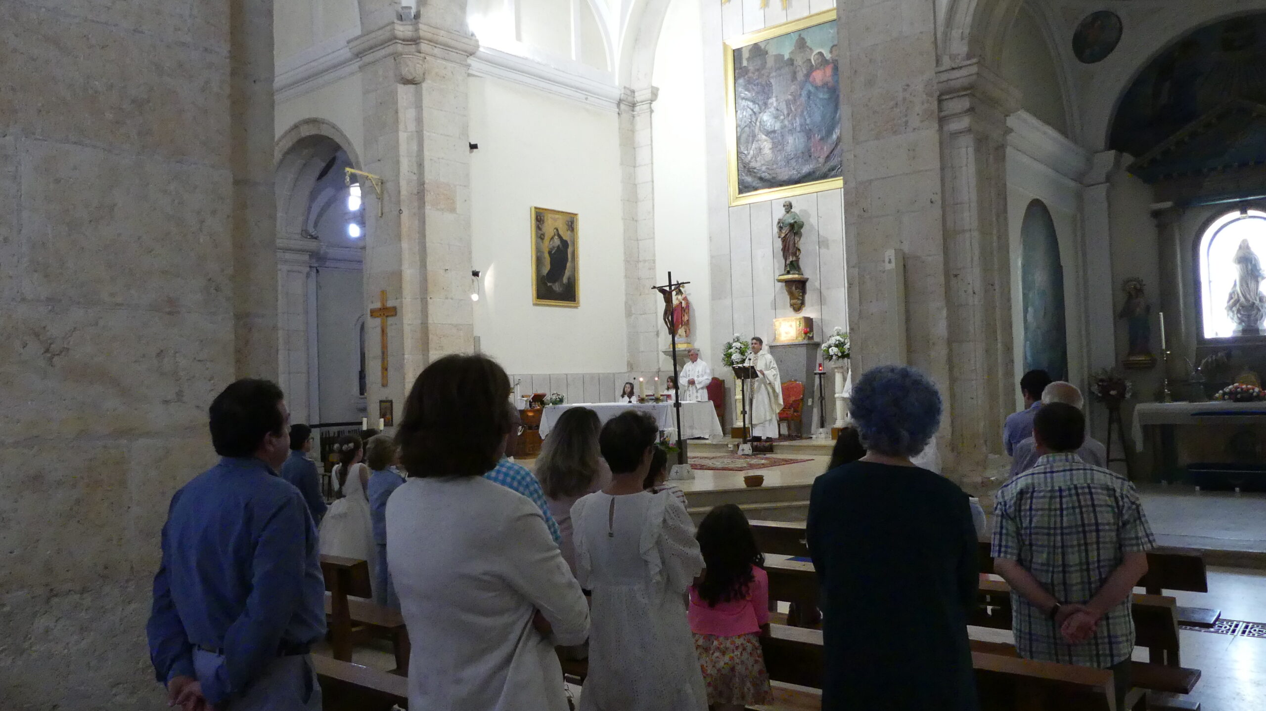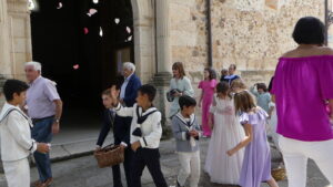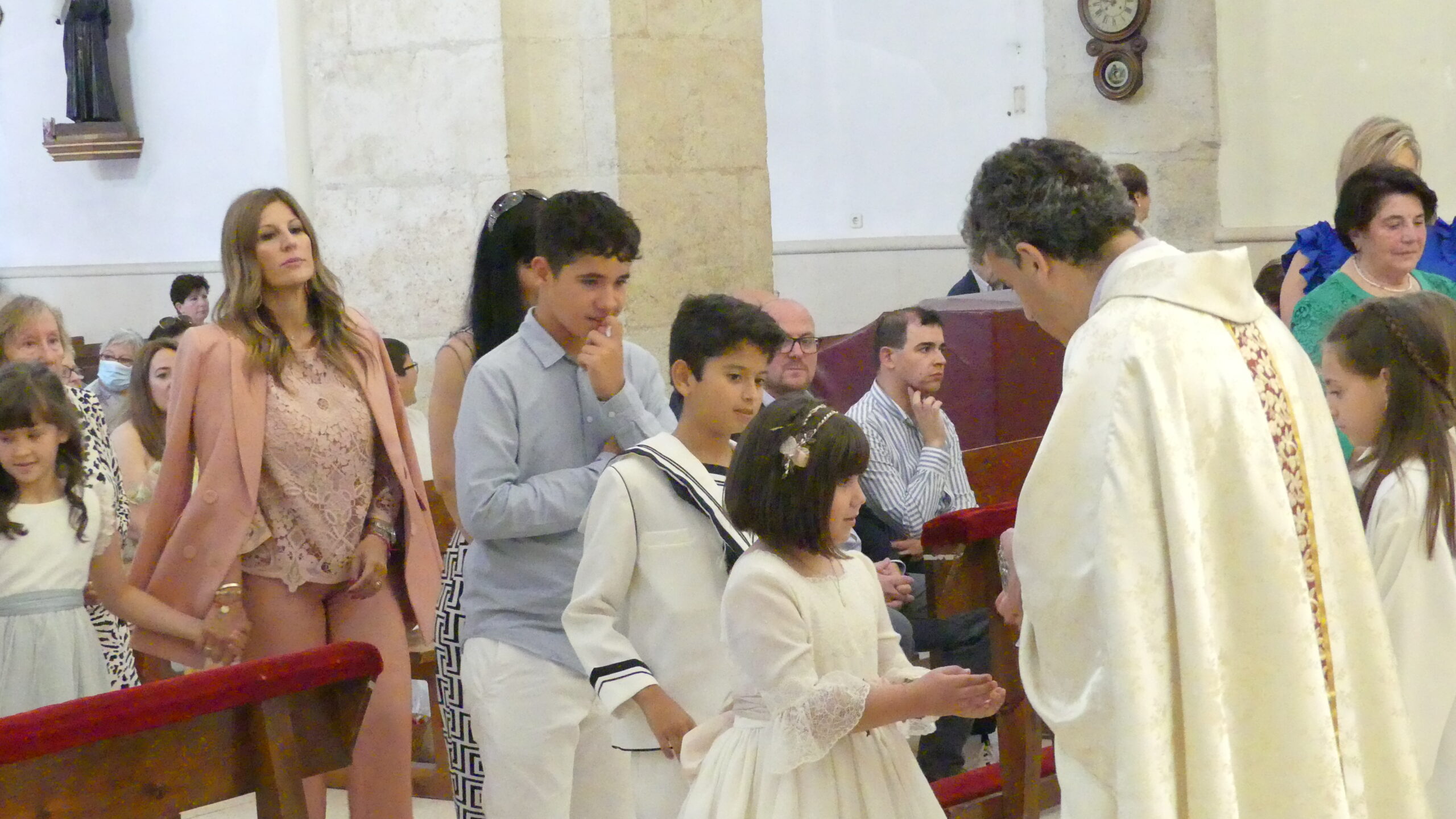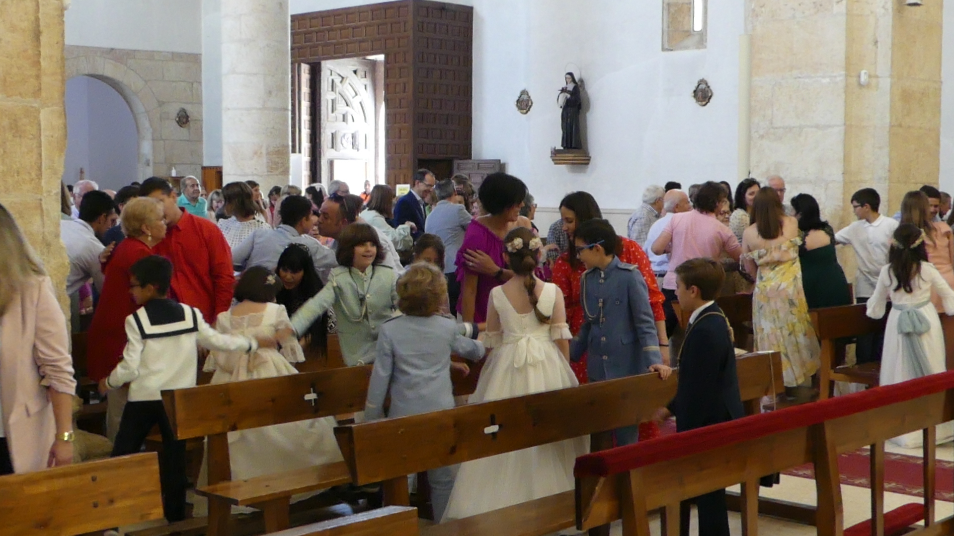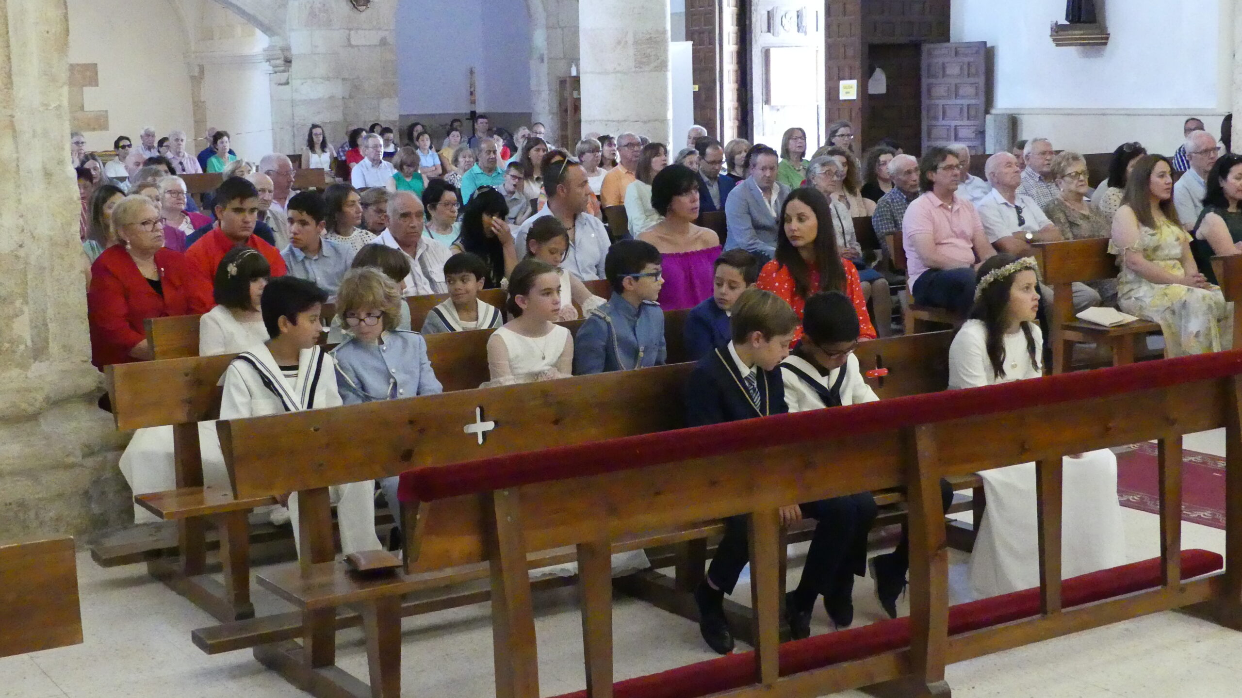 El Corpus ha concluido con la vuelta a la iglesia en la que los niños de la Comunión han vaciado sus cestas de pétalos en la puerta del templo mientras entraba la Custodia del Santísimo.