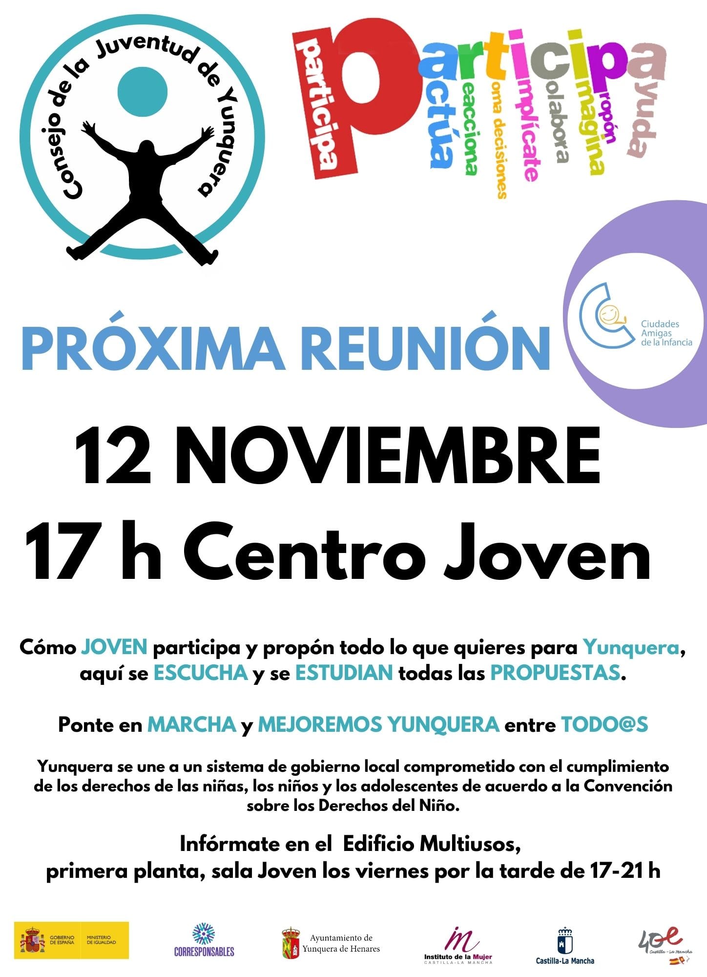 El Centro Joven de Yunquera de Henares acogerá el próximo sábado 12 de noviembre, a partir de las 17.00 horas, una nueva reunión de cara a que la localidad se convierta en ‘Ciudad Amiga de la Infancia’.
