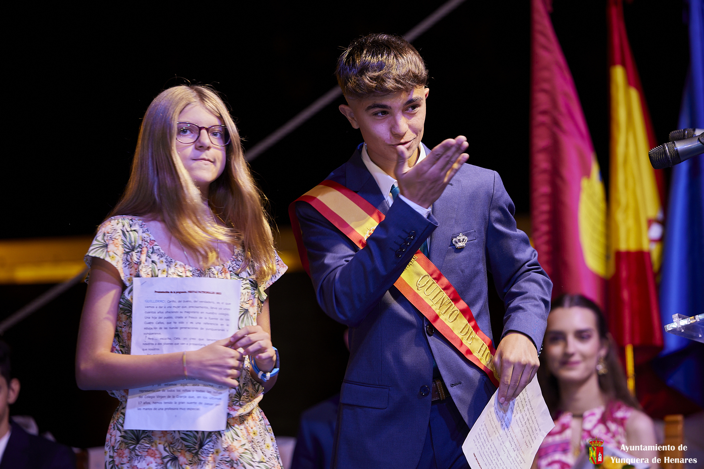 Seguidamente, llegó el momento de coronar a los nuevos Quintos de Honor: Rubén, Luna, Luis, Lucía, Laura, Ismael, Iker, Daniel, Clara, Bianca, Andrés y Abel. Además, se agradeció su magnífica labor a los Quintos de Honor salientes: Alejandra, Álvaro, Ana, Andrea, Carmen, Héctor, Hugo, Mónica y Sergio.